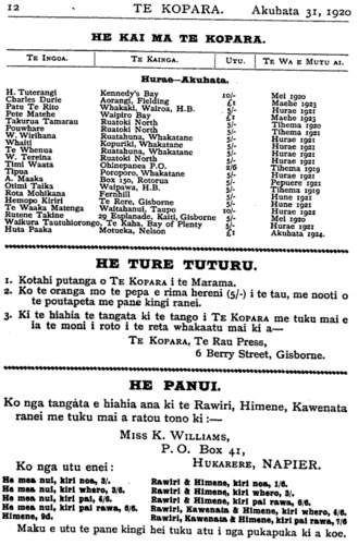 HE KAI MA TE KOPARA. TE INGOA. TE KAINGA. UTU. TE WA E MUTU Al. Hurae - Akuhata. H. Tuterangi Kennedy's Bay 10/- Mei 1920 Charles Durie Aorangi Flelding £1 Maehe 1923 Patu Te Rito Whakaki, Wairoa, H.B. 5/- Hurae 1921 Pete Matehe Waipiro Bay £1 Maehe 1923 Takurua Tamarau Ruatoki North 5/- Tihema 1920 Pouwhare Ruatoki North 5/- Tihema 1921 W.Wirihana Ruatahuna, Whakatane 5/- }Hurae 1921 Whaiti Kopuriki, Whakatane 5/-- Hurae 1921 Te Whenua Ruatahuna, Whakatane 5/- Hurae 1921 W. Tereina Ruatoki North 5/-- Hurae 1921 Timi Waata Ohinepanea P.O. 2/6 Tihema 1919 Tipua Poroporo, Whakatane 5/- Hurae 1921 A. Maaka Box 150, Rotorua 5/- Pepuere 1921 Otimi Taika Waipawa, H.B. 5/- Tihema 1919 Rota Mohikana Fernhill 5/- Hune 1921 Hemopo Kiriri Te Rere, Gisborne 5/- Hune 1921 Te Waaka Matenga Waitahanui, Taupo 10/- Hurae 1922 Rutene Takine 29 Esplanade, Kaiti, Gisborne 5/- Mei 1920 Waikura Tautuhiorongo, Te Kaha, Bay of Plenty 5/- Hurae 1921 Huta Paaka Motueka, Nelson £1 Akuhata 1924. HE TURE TUTURU. 1. Kotahi putanga o TE KOPARA i te Marama. 2. Ko te oranga mo te pepa e rima hereni (5/-) i te tau, me nooti o te poutapeta me pane kingi ranei. 3. Ki te hiahia te tangata ki te tango i TE KOPARA me taku mai e ia te moni i roto i te reta whakaatu mai ki a TE KOPARA, Te Rau Press, 6 Berry Street, Gisborne. HE PANUI. Ko nga tangata e hiahia ana ki te Rawiri, Himene, Kawenata ranei me tuku mai a ratou tono ki: Miss K. WILLIAMS, P. O. Box 41, HUKARERE, NAPIER. Ko nga utu enei: He mea nui, kiri noa, 3/. Rawiri & Himene, kiri noa, 1/6 Ha mea nui, kiri wharo, 3/6. Rawiri & Himene, kiri whero, 3/ Ha mea nui, kiri pai, 4/6. Rawiri & Himene, kiri pai rawa; 6/6. He mea nui, kiri pai rawa, 6/6. Rawiri, Kawenata & Himene, kiri wharo, 4/6. Himene, 9d. Rawiri, Kawenata & Himene, kiri pai rawa, 7/6 Maku e utu te pane kingi hei tuku atu i nga pukapuka ki a koe. Printed and published by HERBERT WILLIAM WILLIAMS, at Te Rau Printing Works Berry Street, Gisborne, New Zealand. - August 31, 1920.