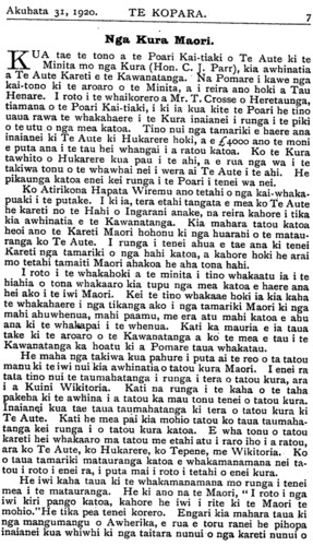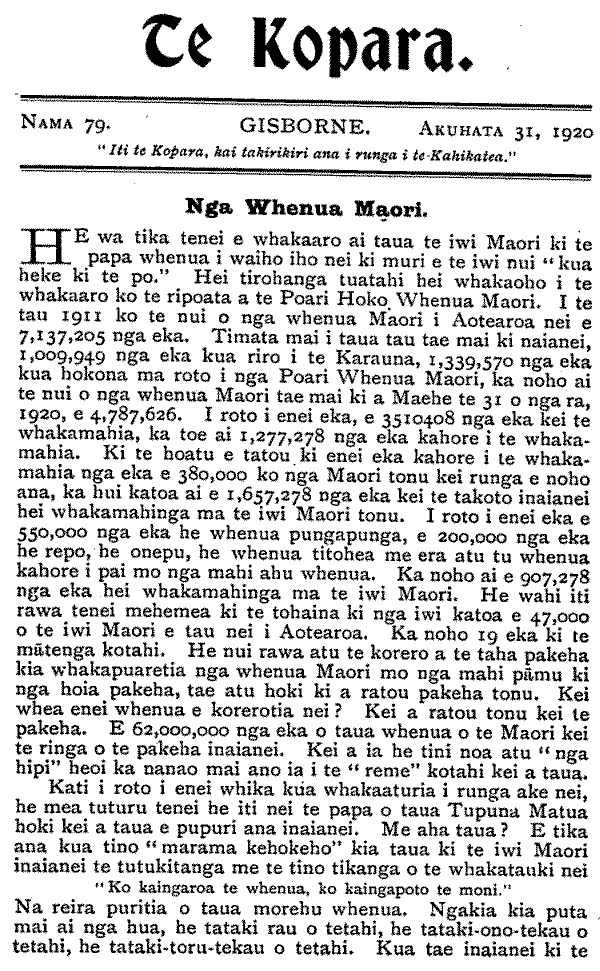 Te Kopara. NAMA 79. GISBORNE. AKUHATA 31, 1920 "Iti te Kopara, kai takirikiri ana i runga i te Kahikatea." Nga Whenua Maori. HE wa tika tenei e whakaaro ai taua te iwi Maori ki te papa whenua i waiho iho nei ki muri e te iwi nui "kua heke ki te po." Hei tirohanga tuatahi hei whakaoho i te whakaaro ko te ripoata a te Poari Hoko Whenua Maori. I te tau 1911 ko te nui o nga whenua Maori i Aotearoa nei e 7,137,205 nga eka. Timata mai i taua tau tae mai ki naianei, 1,009,949 nga eka kua riro i te Karauna, 1,339,570 nga eka kua hokona ma roto i nga Poari Whenua Maori, ka noho ai te nui o nga whenua Maori tae mai ki a Maehe te 31 o nga ra, 1920, e 4,787,626. I roto i enei eka, e 3510408 nga eka kei te whakamahia, ka toe ai 1,277,278 nga eka kahore i te whakamahia. Ki te hoatu e tatou ki enei eka kahore i te whakamahia nga eka e 380,000 ko nga Maori tonu kei runga e noho ana, ka hui katoa ai e 1,657,278 nga eka kei te takoto inaianei hei whakamahinga ma te iwi Maori tonu. I roto i enei eka e 550,000 nga eka he whenua pungapunga, e 200,000 nga eka he repo, he onepu, he whenua titohea me era atu tu whenua kahore i pai mo nga mahi ahu whenua. Ka noho ai e 907,278 nga eka hei whakamahinga ma te iwi Maori. He wahi iti rawa tenei mehemea ki te tohaina ki nga iwi katoa e 47,000 o te iwi Maori e tau nei i Aotearoa. Ka noho 19 eka ki te matenga kotahi. He nui rawa atu te korero a te taha pakeha kia whakapuaretia nga whenua Maori mo nga mahi pamu ki nga hoia pakeha, tae atu hoki ki a ratou pakeha tonu. Kei whea enei whenua e korerotia nei ? Kei a ratou tonu kei te pakeha. E 62,000,000 nga eka o taua whenua o te Maori kei te ringa o te pakeha inaianei. Kei a ia he tini noa atu " nga hipi" heoi ka nanao mai ano ia i te " reme" kotahi kei a taua. Kati i roto i enei whika kua whakaaturia i runga ake nei, he mea tuturu tenei he iti nei te papa o taua Tupuna Matua hoki kei a taua e pupuri ana inaianei. Me aha taua ? E tika ana kua tino "marama kehokeho" kia taua ki te iwi Maori inaianei te tutukitanga me te tino tikanga o te whakatauki nei . "Ko kaingaroa te whenua, ko kaingapoto te moni." Na reira puritia o taua morehu whenua. Ngakia kia puta mai ai nga hua, he tataki rau o tetahi, he tataki-ono-tekau o tetahi, he tataki-toru-tekau o tetahi. Kua tae inaianei ki te