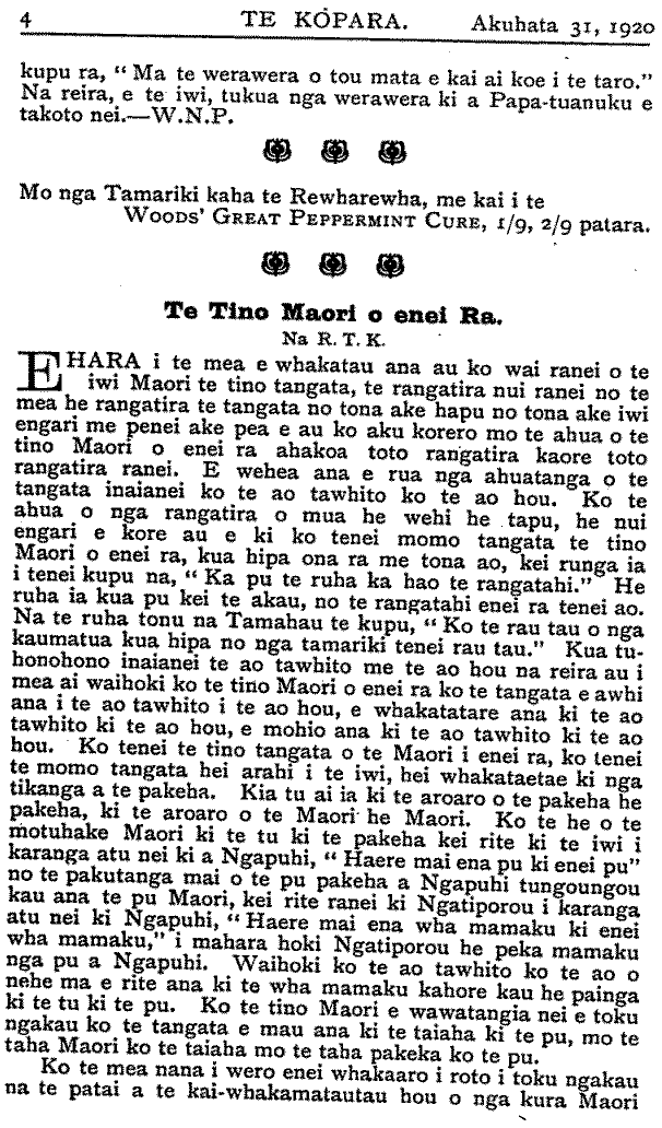 kupu ra, "Ma te werawera o tou mata e kai ai koe i te taro." Na reira, e te iwi, tukua nga werawera ki a Papa - tuanuku e takoto nei. - W .N .P. Mo nga Tamariki kaha te Rewharewha, me kai i te WOODS' GREAT PEPPERMINT CURE, 1/9, 2/9 patara. Te Tino Maori o enei Ra. Na R.T.K. EHARA i te mea e whakatau ana au ko wai ranei o te iwi Maori te tino tangata, te rangatira nui ranei no te mea he rangatira te tangata no tona ake hapu no tona ake iwi engari me penei ake pea e au ko aku korero mo te ahua o te tino Maori o enei ra ahakoa toto rangatira kaore toto rangatira ranei. E wehea ana e rua nga ahuatanga o te tangata inaianei ko te ao tawhito ko te ao hou. Ko te ahua o nga rangatira o mua he wehi he tapu, he nui engari e kore au e ki ko tenei momo tangata te tino Maori o enei ra, kua hipa ona ra me tona ao, kei runga ia i tenei kupu na, " Ka pu te ruha ka hao te rangatahi."He ruha ia kua pu kei te akau, no te rangatahi enei ra tenei ao. Na te ruha tonu na Tamahau te kupu, "Ko te rau tau o nga kaumatua kua hipa no nga tamariki tenei rau tau." Kua tuhonohono inaianei te ao tawhito me te ao hou na reira au i mea ai waihoki ko te tino Maori o enei ra ko te tangata e awhi ana i te ao tawhito i te ao hou, e whakatatare ana ki te ao tawhito ki te ao hou, e mohio ana ki te ao tawhito ki te ao hou. Ko tenei te tino tangata o te Maori i enei ra, ko tenei te momo tangata hei arahi i te iwi, hei whakataetae ki nga tikanga a te pakeha. Kia tu ai ia ki te aroaro o te pakeha he pakeha, ki te aroaro o te Maori he Maori. Ko te he o te motuhake Maori ki te tu ki te pakeha kei rite ki te iwi i karanga atu nei ki a Ngapuhi, " Haere mai ena pu ki enei pu" no te pakutanga mai o te pu pakeha a Ngapuhi tungoungou kau ana te pu Maori, kei rite ranei ki Ngatiporou i karanga atu nei ki Ngapuhi, "Haere mai ena wha mamaku ki enei wha mamaku," i mahara hoki Ngatiporou he peka mamaku nga pu a Ngapuhi. Waihoki ko te ao tawhito ko te ao o nehe ma e rite ana ki te wha mamaku kahore kau he painga ki te tu ki te pu. Ko te tino Maori e wawatangia nei e toku ngakau ko te tangata e mau ana ki te taiaha ki te pu, mo te taha Maori ko te taiaha mo te taha pakeka ko te pu. Ko te mea nana i wero enei whakaaro i roto i toku ngakau na te patai a te kai-whakamatautau hou o nga kura Maori