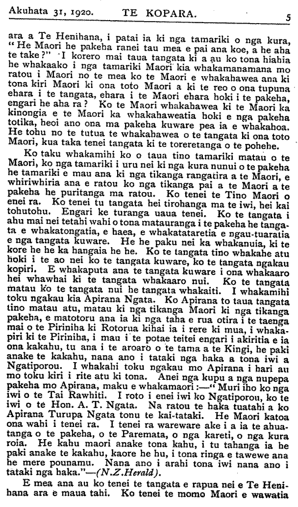 ara a Te Henihana, i patai ia ki nga tamariki o nga kura, " He Maori he pakeha ranei tau mea e pai ana koe, a he aha te take ?" I korero mai taua tangata ki a au ko tona hiahia he whakaako i nga tamariki Maori kia whakamanamana mo ratou i Maori no te mea ko te Maori e whakahawea ana ki tona kiri Maori ki ona toto Maori a ki te reo o ona tupuna ehara i te tangata, ehara i te Maori ehara hoki i te pakeha, engari he aha ra ? Ko te Maori whakahawea ki te Maori ka kinongia e te Maori ka whakahaweatia hoki e nga pakeha totika, heoi ano ona ma pakeha kuware pea ia e whakahoa. He tohu no te tutua te whakahawea o te tangata ki ona toto Maori, kua taka tenei tangata ki te toreretanga o te pohehe. Ko taku whakamihi ko o taua tino tamariki matau o te Maori, ko nga tamariki i uru nei ki nga kura nunui o te pakeha he tamariki e mau ana ki nga tikanga rangatira a te Maori, e whiriwhiria ana e ratou ko nga tikanga pai a te Maori a te pakeha he puritanga ma ratou. Ko tenei te Tino Maori o enei ra. Ko tenei tu tangata hei tirohanga ma te iwi, hei kai tohutohu. Engari ke turanga uaua tenei. Ko te tangata i ahu mai nei tetahi wahi o tona matauranga i te pakeha he tangata e whakatongatia, e haea, e whakatataretia e ngau-tuaratia e nga tangata kuware. He he paku nei ka whakanuia, ki te kore he he ka hangaia he he. Ko te tangata tino whakahe atu hoki i te ao nei ko te tangata kuware, ko te tangata ngakau kopiri. E whakaputa ana te tangata kuware i ona whakaaro hei whawhai ki te tangata whakaaro nui. Ko te tangata matau ko te tangata nui he tangata whakaiti. I whakamihi toku ngakau kia Apirana Ngata. Ko Apirana to taua tangata tino matau atu, matau ki nga tikanga Maori ki nga tikanga pakeha, e matotoru ana ia ki nga taha e rua otira i te taenga mai o te Piriniha ki Rotorua kihai ia i rere ki mua, i whakapiri ki te Piriniha, i mau i te potae teitei engari i akiritia e ia ona kakahu, tu ana i te aroaro o te tama a te Kingi, he paki anake te kakahu, nana ano i tataki nga haka a tona iwi a Ngatiporou. I whakahi toku ngakau mo Apirana i hari au mo toku kiri i rite atu ki tona. Anei nga kupu a nga nupepa pakeha mo Apirana, maku e whakamaori: " Muri iho ko nga iwi o te Tai Rawhiti. I roto i enei iwi ko Ngatiporou, ko te iwi o te Hon. A. T. Ngata. Na ratou te haka tuatahi a ko Apirana Turupa Ngata tonu te kai - tataki. He Maori katoa ona wahi i tenei ra. I tenei ra wareware ake i a ia te ahuatanga o te pakeha, o te Paremata, o nga kareti, o nga kura roia. He kahu maori anake tona kahu, i tu tahanga ia he paki anake te kakahu, kaore he hu, i tona ringa e tawewe ana he mere pounamu. Nana ano i arahi tona iwi nana ano i tataki nga haka." - (N.Z.Herald). E mea ana au ko tenei te tangata e rapua nei e Te Henihana ara e maua tahi. Ko tenei te momo Maori e wawatia