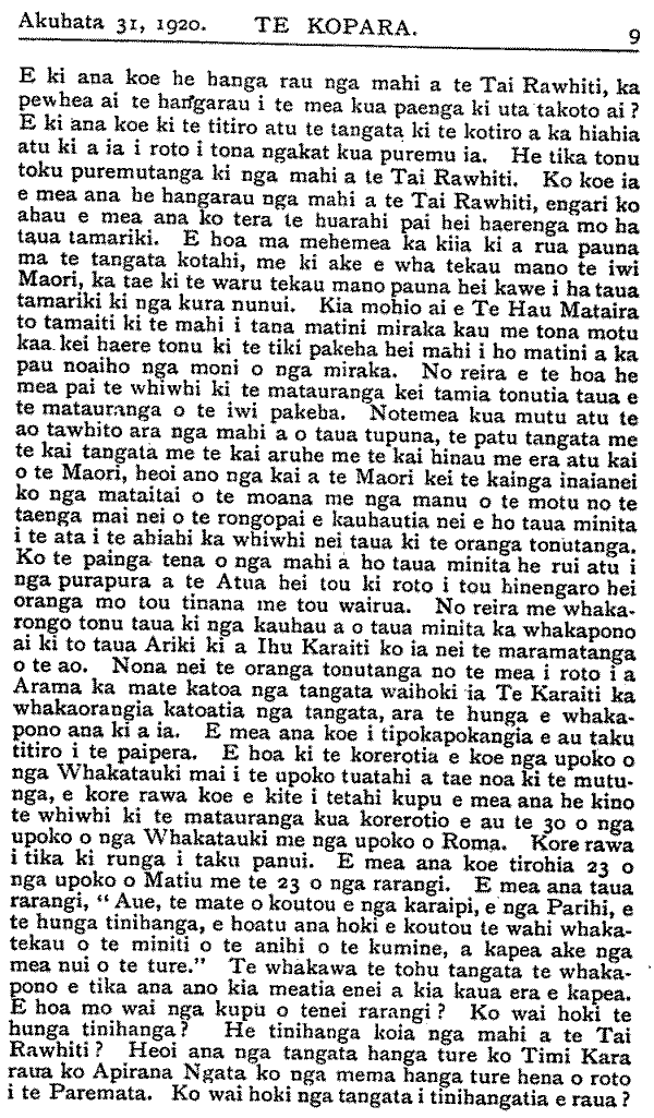 E ki ana koe he hanga rau nga mahi a te Tai Rawhiti, ka pewhea ai te hangarau i te mea kua paenga ki uta-takoto ai ? E ki ana koe ki te titiro atu te tangata ki te kotiro a ka hiahia atu ki a ia i roto i tona ngakat kua puremu ia. He tika tonu toku puremutanga ki nga mahi a te Tai Rawhiti. Ko koe ia e mea ana he hangarau nga mahi a te Tai Rawhiti, engari ko ahau e mea ana ko tera te huarahi pai hei haerenga mo ha taua tamariki. E hoa ma mehemea ka kiia ki a rua pauna ma te tangata kotahi, me ki ake e wha tekau mano te iwi Maori, ka tae ki te waru tekau mano pauna hei kawe i ha taua tamariki ki nga kura nunui. Kia mohio ai e Te Hau Mataira to tamaiti ki te mahi i tana matini miraka kau me tona motu kaa kei haere tonu ki te tiki pakeha hei mahi i ho matini a ka pau noaiho nga moni o nga miraka. No reira e te hoa he mea pai te whiwhi ki te matauranga kei tamia tonutia taua e te matauranga o te iwi pakeha. Notemea kua mutu atu te ao tawhito ara nga mahi a o taua tupuna, te patu tangata me te kai tangata me te kai aruhe me te kai hinau me era atu kai o te Maori, heoi ano nga kai a te Maori kei te kainga inaianei ko nga mataitai o te moana me nga manu o te motu no te taenga mai nei o te rongopai e kauhautia nei e ho taua minita i te ata i te ahiahi ka whiwhi nei taua ki te oranga tonutanga. Ko te painga tena o nga mahi a ho taua minita he rui atu i nga purapura a te Atua hei tou ki roto i tou hinengaro hei oranga mo tou tinana me tou wairua. No reira me whakarongo tonu taua ki nga kauhau a o taua minita ka whakapono ai ki to taua Ariki ki a Ihu Karaiti ko ia nei te maramatanga o te ao. Nona nei te oranga tonutanga no te mea i roto i a Arama ka mate katoa nga tangata waihoki ia Te Karaiti ka whakaorangia katoatia nga tangata, ara te hunga e whakapono ana ki a ia. E mea ana koe i tipokapokangia e au taku titiro i te paipera. E hoa ki te korerotia e koe nga upoko o nga Whakatauki mai i te upoko tuatahi a tae noa ki te mutunga, e kore rawa koe e kite i tetahi kupu e mea ana he kino te whiwhi ki te matauranga kua korerotio e au te 30 o nga upoko o nga Whakatauki me nga upoko o Roma. Kore rawa i tika ki runga i taku panui. E mea ana koe tirohia 23 o nga upoko o Matiu me te 23 o nga rarangi. E mea ana taua rarangi, "Aue, te mate o koutou e nga karaipi, e nga Parihi, e te hunga tinihanga, e hoatu ana hoki e koutou te wahi whakatekau o te miniti o te anihi o te kumine, a kapea ake nga mea nui o te ture."Te whakawa te tohu tangata te whakapono e tika ana ano kia meatia enei a kia kaua era e kapea. E hoa mo wai nga kupu o tenei rarangi ? Ko wai hoki te hunga tinihanga ? He tinihanga koia nga mahi a te Tai Rawhiti ? Heoi ana nga tangata hanga ture ko Timi Kara raua ko Apirana Ngata ko nga mema hanga ture hena o roto i te Paremata. Ko wai hoki nga tangata i tinihangatia e raua ?