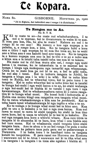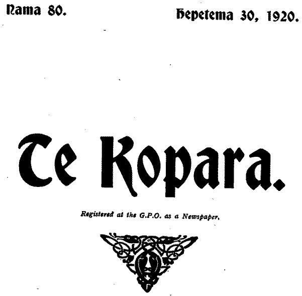 Rama 80. Kepetema 30, 1920. Te Kopara. Registered at the G.P.O. as a Newspaper, Te Oranga mo tenei pepa e Rima Kereni mo te Tau.