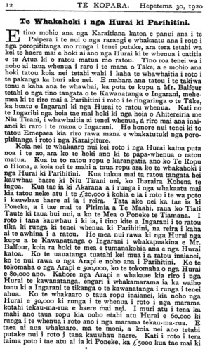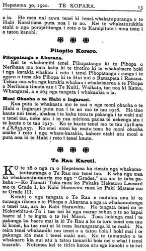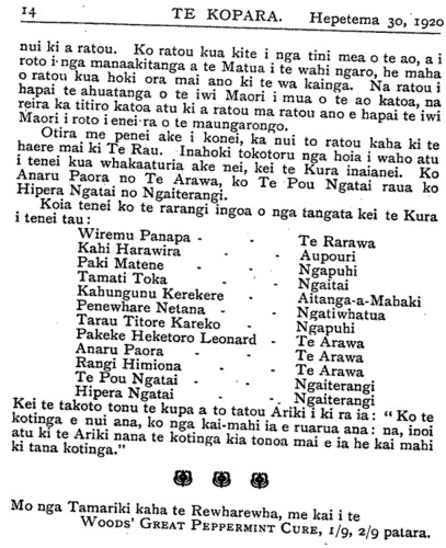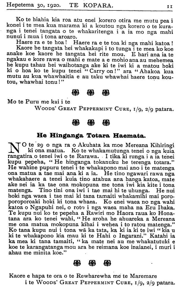 E hoa ehara tenei i te mahi tika ma taua te uta hara ki runga i te hunga e kimi ana i te ora mo te iwi Maori. E hoa mehemea e kite ana koe i te huarahi tika e ora ai a taua tamariki tena ra whakaaturia mai ki a tirohia atu te painga o tau huarahi. E mea ana koe me unu e au taku panui i Te Kopara No. 66. He aha koia te mate i pa mai ki a koutou ko ho tamariki e moe mai ra i Taranaki ? Mo haku kupu mihi ki te kaha o te Tai Rawhiti ki te kohi i tera moni nui ara i te £50,000 hei ora mo ha tamariki i hoki mai nei i te pakanga, he mea kino koia tena ki a koe ? E hoa e kore e mutu taku whakamoemiti ki nga mahi a te Tai Rawhiti. Kihai nei ratou i kauhautia kia kaha ki te pupuru i tona paku oneone pena ake te moni o te huruhuru hipi me te wai e rere ana, ma wai e whakakorekore tana ? Tena ko ho tamariki e kiia mai nei, E hoa, nui atu i te wha tekau nga tau o Te Whiti raua ko Tohu e kauhau ana ki ho tamariki kia kaua hei reti hei hoko hoki, no te mea ki te hoko te tangata i tona whenua e hoko ana ia i tona matua ko tou oranga hoki tena. Kotahi ano homaitanga a te Atua i te whenua mou. Nga kupu nei tika tonn i kuhu mai i tetahi o hoku taringa puta rawa atu i tetahi. I te matenga o Te Whiti raua ko Tohu tere ana a Parihaka i te moana, tae atu hoki ki te riu o Waikato e mahi nei ano ki te hoko i henei rangi. Ta te motuka pai hoki hei whakaara i te moe a ho tamariki. Ka pai hoki nga rori o Taranaki, huhu kau ana te rere a te moutuka! Mo to kupu mo Horomona ara mo te matauranga i homai nei e te Atua ki a ia, i mea mai te Atua ki a Horomona, "Inoi mai ko te aha e hoatu ki a koe." No reira mei kore i homai i runga, e kore a Horomona e whiwhi. Titiro ki te tamaiti a Horomona, i tangohia nei te matauranga i a ia me nga iwi kotahi tekau o Iharaira. Kati pea i konei kei hoha koutou, e taea hoki te aha i te nui ano o nga kupu a Te Hau Mataira. Na HUTA PAAKA. Motueka, 7 Hurae, 1920. He Titorehanga no te Hahi o Roma. KUA tae mai te whakaatu no Akarama, he taone no Korotia (Croatia), mo te ahua o nga pirihi o te Hahi o Roma kei reira. Ko to ratou tokomaha e 400. Kua tono ratou kia hoatu ki a ratou ano te mana whakatu i etahi Pihopa mo ratou: tuarua, kia whakakorea atu te reo Ratina i roto i a ratou karakia; tuatoru, kia tukua ratou kia marena ki te wahine. Kaore e hapa te ora o te Rewharewha me te Maremare i te WOODS' GREAT PEPPERMINT CURE, 1/9, 2/9 patara.
