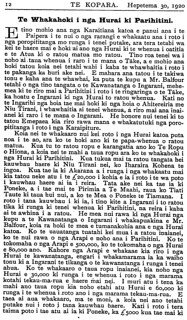 Te Whakahoki i nga Hurai ki Parihitini. E tino mohio ana nga Karaitiana katoa e panui ana i te Paipera i te nui o nga rarangi e whakaatu ana i roto i nga poropititanga mo runga i tenei putake, ara tera tetahi wa kei te haere mai e hoki ai ano nga Hurai ki te whenua i oatitia e te Atua ki o ratou matua mo ratou. Tino roa tenei wa i noho~ai taua whenua i raro i te mana o Tãke, a e mohio ana hoki tatou koia nei tetahi wahi i kaha te whawhaitia i roto i te pakanga ka huri ake nei. E mahara ana tatou i te takiwa tonu e kaha ana te whawhai, ka puta te kupu a Mr. Balfour tetahi o nga tino tangata o te Kawanatanga o Ingarani, mehemea ki te riro mai a Parihitini i roto i te ringaringa o te Tãke, ka hoatu e Ingarani ki nga Hurai to ratou whenua. Kati no te Ingarihi nga hoia tae mai hoki ki nga hoia o Ahitereiria me Niu Tirani, i whawhaitia ai tenei whenua, a riro mai ana inaianei ki raro i te mana o Ingarani. He honore nui tenei ki to tatou Emepaea kia riro rawa mana e whakatutuki nga poropititanga i roto i nga Karaipiture. Koia nei te whakaaro nui kei roto i nga Hurai katoa puta noa i te ao, ara ko te hoki ano ki te papa-whenua o ratou matua. Kua tu to ratou ropu e karangatia ano ko Te Ropu o Hiona, a koia nei te mahi a taua ropu ara ko te whakahoki i nga Hurai ki Parihitini. Kua tukua mai ta ratou tangata hei kauwhau haere ki Niu Tirani nei, ko Iharaira Kohena te ingoa. Kua tae ia ki Akarana a i runga i nga whakaatu mai kia tatou neke atu i te £20,000 i kohia e ia i roto i te wa poto i kauwhau haere ai ia i reira. Tata ake nei ka tae ia ki Poneke, a i tae mai te Pirimia a Te Maahi, raua ko Tiati Taute ki taua hui nui, a ko te Mea o Poneke te Tiamana. I roto i tana kauwhau i ki ia, i tino kite a Ingarani i to ratou tika ki runga ki tenei whenua ki Parihitini, na reira i kaha ai te awhina i a ratou. He mea nui rawa ki nga Hurai nga kupu a te Kawanatanga o Ingarani i whakapuakina e Mr. Balfour, koia ra hoki te mea e tumanakohia ana e nga Hurai katoa. Ko te uauatanga tuatahi kei mua i a ratou inaianei, ko te nui rawa o nga Arapi e noho ana i Parihitini. Ko te tokomaha o nga Arapi e 500,000, ko te tokomaha o nga Hurai e 80,000 ano. Kahore nga Arapi e whakaae kia riro i nga Hurai te kawanatanga, engari i whakamarama ia ka waiho tonu ki a Ingarani te tikanga o te kawanatanga i runga i tenei ahua. Ko te whakaaro o taua ropu inaianei, kia noho nga Hurai e 30,000 ki runga i te whenua i roto i nga marama kotahi tekau-ma-rua e haere mai nei. I muri atu i tena ka mahi ano taua ropu kia noho etahi atu Hurai e 60,000 ki runga i te whenua i roto ano i nga marama tekau-ma-rua. E taea ai aua whakaaro, ma te moni, a koia nei ano tetahi putake nui i roto i tana kauwhau haere. Kati i roto i tera taima poto i tae atu ai ia ki Poneke, ka £5000 kua tae mai ki