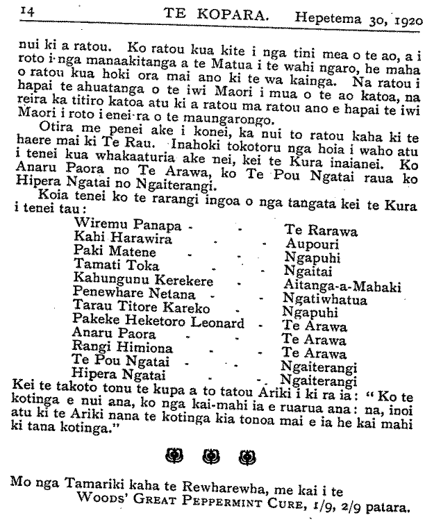 nui ki a ratou. Ko ratou kua kite i nga tini mea o te ao, a i roto i nga manaakitanga a te Matua i te wahi ngaro, he maha o ratou kua hoki ora mai ano ki te wa kainga. Na ratou i hapai te ahuatanga o te iwi Maori i mua o te ao katoa, na reira ka titiro katoa atu ki a ratou ma ratou ano e hapai te iwi Maori i roto i enei ra o te maungarongo. Otira me penei ake i konei, ka nui to ratou kaha ki te haere mai ki Te Rau. Inahoki tokotoru nga hoia i waho atu i tenei kua whakaaturia ake nei, kei te Kura inaianei. Ko Anaru Paora no Te Arawa, ko Te Pou Ngatai raua ko Hipera Ngatai no Ngaiterangi. Koia tenei ko te rarangi ingoa o nga tangata kei te Kura i tenei tau: Wiremu Panapa Te Rarawa Kahi Harawira Aupouri Paki Matene Ngapuhi Tamati Toka Ngaitai Kahungunu Kerekere Aitanga-a-Mahaki Penewhare Netana Ngatiwhatua Tarau Titore Kareko Ngapuhi Pakeke Heketoro Leonard Te Arawa Anaru Paora Te Arawa Rangi Himiona Te Arawa Te Pou Ngatai Ngaiterangi Hipera Ngatai Ngaiterangi Kei te takoto tonu te kupa a to tatou Ariki i ki ra ia: " Ko te kotinga e nui ana, ko nga kai-mahi ia e ruarua ana: na, inoi atu ki te Ariki nana te kotinga kia tonga mai e ia he kai mahi ki tana kotinga." Mo nga Tamariki kaha te Rewharewha, me kai i te WOODS' GREAT PEPPERMINT CURE, 1/9, 2/9 patara.