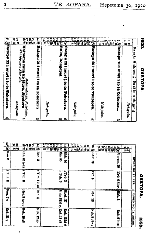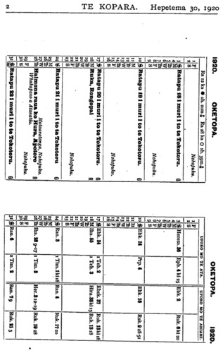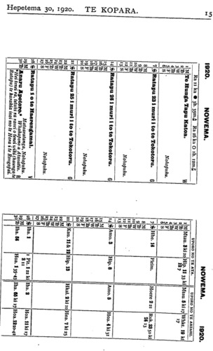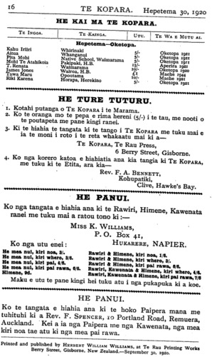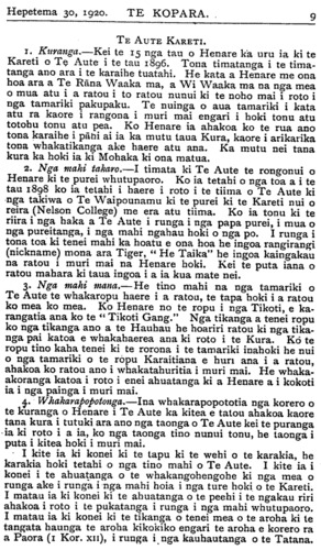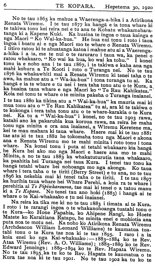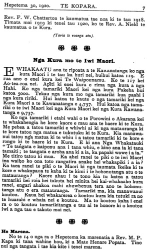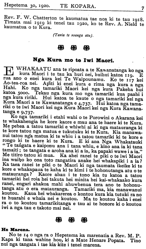 Rev. F. W. Chatterton te kaumatua tae noa ki te tau 1918. Timata mai 1919 ki tenei tau 1920, ko te Rev. A. Nield te kaumatua o te Kura. (Tana te roanga atu). Nga Kura mo te Iwi Maori. E WHAKAATU ana te ripoata a te Kawanatanga ko nga kura Maori i te tau ka huri nei, huihui katoa 119. E rua ano o enei kura kei Te Waipounamu. Ko te 117 kei Ao-tea-roa nei. Apiti ki enei kura e rima nga kura a nga Hahi. Ko nga tamariki Maori kei nga kura Pakeha hui katoa 5000. Tekau nga kura mo nga tamariki kua paahi i nga kura ririki. Hui katoa te kaute o nga tamariki kei nga Kura Maori a te Kawanatanga e 4,737. Hui katoa nga tamariki o te iwi Maori kei nga Kura Maori kei nga Kura Kawanatanga e 9,737. Ko nga tamariki i etahi wahi o te Porowini o Akarana kei te whakahengia he kore kaore e mau ana te haere ki te Kura. Me pehea a tatou tamariki e whiwhi ai ki nga matauranga ki te kore tatou nga matua e tukutuku ki te Kura. Kia manawanui tatou nga matua ki te whiu i a tatou tamariki ki te kore e rongo ki te haere ki te Kura. E ki ana Nga Whakatauki " Te tangata e kaiponu ana i tana whiu, e kino ana ia ki tana tamaiti; te tangata e aroha ana ki a ia, ka papaki wawe i a ia." Me titiro tatou ki mua. Ka ahei ranei te piki o te iwi Maori ina waiho ko ona toto rangatira anake hei whakapiki i a ia ? Ka taea ranei te piki o te Maori ki nga taumata ikeike ki te kore e whakapaua te kaha ki te kimi i te hohonutanga atu o te matauranga ? Kaore ahau i te tono kia tu katoa a tatou tamariki hei roia hei takuta hei minita hei kaiwhakaako kura ranei, engari ahakoa mahi ahuwhenua tera ano te hohonutanga atu o era matauranga. Tamariki ma, kia manawanui koutou. Kaua hei whakarerea o kontou kura kia tutuki ra no te huarahi e whaia nei e koutou. Ma to koutou kaha i enei ra o to koutou tamarikitanga e tau ai te honore ki o koutou iwi a nga tau e takoto mai nei. He Marena. No te 14 o nga ra o Hepetema ka marenatia a Rev. M. P. Kapa ki tana wahine hou, ki a Mate Henare Popata. Tino nui nga tangata i tae kia-kite i tenei marena.