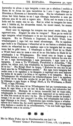 kararehe te ahua o nga tangata o aua pa a ahakoa i mohio a Rota ki te Atua ko ana tamahine ia i aru i nga tikanga a Horoma a Komora a i kararehe raua. Na-he whakaaro no te Atua kei kino katoa te ao i nga tikanga kararehe a aua pa tahuna ana ki te ahi a ngaro atu. Koia nei te mate o te ao koia nei he mate mo te ao. Kei te whai te tangata ko tana ano i hiahia ai, he ahuareka ranei, he moni ranei, he mana ranei, he aha ranei. Heoi ano te rapunga he rongoa mo tenei mate kino, kei ngawari ana. Engari he aha te rongoa ? Kua pa te wehi ki nga tangata whai-whakaaro o te ao mo tenei ahuatanga o te tangata. Ko te Pirimia o Ingarani, ko Roiti Tioti, kua whakatupato i nga iwi mo tenei ahuatanga. Na te ngakau apo hoki o te Tiamana i whawhai ai te ao katoa a ahakoa kua mutu te whawhai ko te ngakau apo o te tangata kei te mau tonu kei te piki tonu. I whaikupu a Roiti Tioti ki te Hahi o Weiri heoi ano te mea e ora ai te ao kia kaha te Hahi ki te whakaako i te Whakapono. Ko tenei ano te kupu a nga Pirimia katoa o te Emepaea. I mea ratou kahore he ora mo te ao i nga kawanatanga i nga paremete, i nga ture a te tangata. I mea a Te Wirihana, Perehitini o Amerika, "He aitua, he aitua nui, ina whakaitia te kauwhau i te Rongopai ki te ao." Na Kingi Hori te kupu, "Kahore he ora mo te ao heoi ano ko te Whakapono anake." Ko nga ture tangata kei waho noa o te ngakau o te tangata e rapirapi atu ana kahore he kaha ki te patu i te kino o te ngakau o te tangata. Ko te Whakapono he whakahuri he whakawhanau hou i te ngakau kia kino ki te hara kia aroha ki te pai ki te Atua. Koia nei te tikanga o nga kupu a Kingi Hori, a Te Wirihana, a Roiti Tioti, a nga Pirimia. E te iwi, kia mau ki te Whakapono hei pa tuwatawata mo taua ki nga kino o te ao kei te kaha tonu, hei tohutohu hei whakatupato. Mahara ki a tatou tamariki kei- te tupu ake, whakapaia te huarahi mo ratou kia ngawari ai ta ratou aru i te tika kia uaua ai te aru i te he. Ko te Hahi anake te kotahitanga i te ao nei hei pupuri i te tika, hei whakaako hei tohu i nga tikanga a te Atua. Tautokona nga minita kaua e whakatatare ki o ratou he, he mahi ngawari noa tera. Ko te tangata tika kahore e mohio ki te whakatatare, "he nui hoki nga hara e hipokina ana e te aroha." Mo te Mate Poho me te Rewharewha me kai i te WOODS' GREAT PEPPERMINT CURE, 1/6, 1/9 patara.