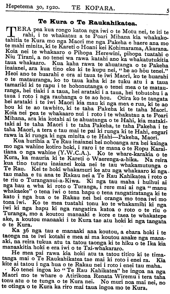 Te Kura o Te Raukahikatea. TERA pea kua rongo katoa nga iwi o te Motu nei, te iti te rahi, i te whakatau a te Poari Mihana kia whakakotahitia te Kura mo nga Maori me nga Pakeha e haere ana mo te mahi minita, ki te Kareti o Hoani kei Kohimarama, Akarana. Koia nei te whakaaro o Pihopa Herewini, pihopa tuatahi o Niu Tirani, a no tenei wa rawa katahi ano ka whakatutukitia taua whakaaro. Kua kaha rawa te ahuatanga o te Pakeha inaianei, ara kua tino eke ki te kupu nei, " he ao hou tenei." Heoi ano te huarahi e ora ai taua te iwi Maori, ko te huarahi o te matauranga, ko to taua kaha ki te tuku atu i a taua tamariki ki te rapu i te hohonutanga o tenei mea o te matauranga, hei tiaki i a taua hei arataki i a taua hei tohutohu i a taua i roto i nga rauhanga o te ao hou. Otira ko te tangata hei arataki i te iwi Maori kia mau ki nga mea e rua, ki te ao hou ki te ao tawhito, ki te taha Pakeha ki te taha Maori. Koia nei pea te whakaaro nui i roto i te whakatau a te Poari Mihana, ara kia kotahi ai te ahuatanga o te Hahi, kia matakitaki ai te taha Maori i te taha Pakeha, te taha Pakeha i te taha Maori, a tera e tau mai te pai ki runga ki te Hahi, engari rawa ia ki runga ki nga minita o te Hahi - Pakeha, Maori. Kua hurihia a Te Rau inaianei hei nohoanga ara hei kainga mo nga wahine kotiro hoki, i raro i te mana o te Ropu Karaitiana o nga wahine (Y.W.C.A.). Ko te whare-karakia o te Kura, ka mauria ki te Kareti o Waerenga-a-hika. Na reira kua tino tuturu inaianei koia nei te tau whakamutunga o Te Rau. Kei te hoki whakamuri ke atu nga whakaaro ki nga tau maha e tu ana te Rakau nei a Te Rau Kahikatea i roto o te riu o Turanganui-a-Kiwa. Ki nga tau maha- i huihui ai nga hau e wha ki roto o Turanga, i rere mai ai nga " manu whakaeke" o tena iwi o tena hapu o tena rangatiratanga ki te kato i nga hua o te Rakau nei hei oranga mo tona iwi mo tona iwi. Ko te mea tuatahi tonu ko te whakamihi ki nga iwi ki nga hapu ki nga rangatira katoa o roto o te riu o Turanga, mo a koutou manaaki e kore e taea te whakatepe ake, a koutou manaaki i te Kura tae atu hoki ki nga tangata o te Kura. Ka 36 nga tau e manaaki ana koutou, a ehara hoki i te taonga na te iwi kotahi e mea ai ma koutou anake nga mana. aki, na reira tukua atu ta tatou taonga ki te hiku o te Ika kia manaakitia hoki e era iwi o te Tai-whakararo. He mea pai rawa kia hoki atu ta tatou titiro ki te timatanga mai o Te Raukahikatea tae mai ki roto i enei ra. Kia kite ai tatou i nga hua o te Rakau nei i roto i enei tau maha. Ko tenei ingoa ko "Te Rau Kahikatea" he ingoa na nga Maori mo te whare o Atirikona Renata Wiremu i tera taha tonu atu o te tunga o te Kura nei. No muri noa mai nei, no te otinga o te Kura ka riro mai taua ingoa mo te Kura,