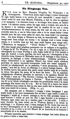 He Hinganga Toa. KUA moe te Rev. Henare Wepiha Te Wainohu i te moengaroa. Tena kua paku nga rongo o tona hinganga ki nga wahi katoa o te motu, ki ana tamariki i tenei wahi i tenei wahi ki ona hoa Maori, Pakeha, a kei te oho te ngakau o te tangata i te ohorere tonu o te rongo kua mate, te hakiri rawa i te takoto mate, otira ko nga mea e tutata atu ana ki a ia kaore i te miharo engari kei te mohio ki te nui o tona whakamanawanui ki tona mate, ka hia nei te roa o te wa e nonoke ana ia, a na te hira tonu ake o to te mate kaha i tona katahi ano ka tau tona taha ki raro, ka moe hoki i te moenga roa. Ae kua hinga a Henare te toa, te marohirohi. Ko nga tangi enei kua rongo au mona i te taenga mai o tona rongo mate, a e mohio ana au kei nga wahi katoa aua tangi ara: "Moumou te tangata!" "Poor Padre!" "Poor Harry!" He tino tangi enei ahakoa potopoto no te takere o te ngakau. I hinga ia ki Te Wairoa i te 29 o nga ra o Hepetema nei a i uhungatia ia e tona Pariha e ona hapu hoki ki te Uhi tetahi o nga pa nunui o tona pariha, ka toru nga ra i uhungatia ai ka mauria tona tinana ki Mohaka tanu ai te kainga o ona matua, tupuna, te kainga o tona whanautanga. Ahakoa pewhea a tatau whiriwhiri a te ngakau Maori mo tenei mate ahakoa pewhea to tatou wawata tumanako hoki mo tenei tangata i tutuki te whakatauki na te pakeha, " man proposes, God disposes," ara kei te Atua te tikanga o a tatou hanga katoa. Ki te hiahia tatou kia penei kia pera ranei tetahi mea ki te hiahia te Atua kia pera ka pera, ki te kore ka kore. Ta te ngakau whakapono ahakoa pewhea te mamae o te ngakau Maori ko ta Hopa i mea ra " Na Ihowa i homai, na Ihowa i tango atu, Kia whakapaingia te Ingoa o Ihowa." Kua tutuki pea tona wa ki to te Atua whakaaro na reira ka powhiritia mai e ia tana pononga kia haere atu ki a ia. Ko te wahi ki a tatou ko tenei ara ahakoa kua mate ia kei te ora ana mahi kei te korero tonu mai aua mahi ki a tatou. (Hip. 11 . 4.). He tangata nui a Henare i runga i tona kaupapa i ana mahi hoki, a he ture nonamata iho te tito i nga mahi a enei tu tangata i mahi ai o ratou oranga a ko te tino putake tenei o enei korero i tuhia ai ara he tito i nga korero o te oranga o Henare nga mea ano ia e matau ana i te kai-tuhi. I mua o enei korero he mea naku na te Wairua katoa o te Atua te arahinga i a Henare mai i tona taenga ki Te Aute tae noa ki te wa i karangatia ai ia ki te pakanga, i kake ai ia ki te nui i whiwhi ai ia, o roto o te iwi Maori ki te kororia ki te honore i motuhake ki a ia anake. Whaia haeretia nga korero o tona oranga hei reira kitea ai te pono o taku e mea nei.