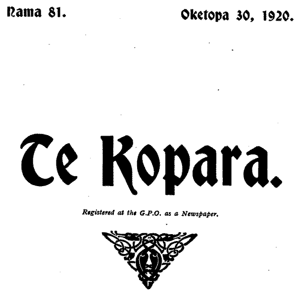 Te Kopara. Registered at the G.P.O. as a Newspaper. Nama 81. Oketopa 30, 1920. Te Oranga mo tenei pepa e Rima hereni mo te tau.