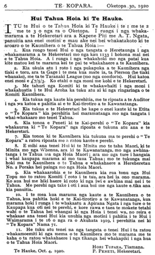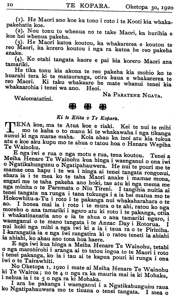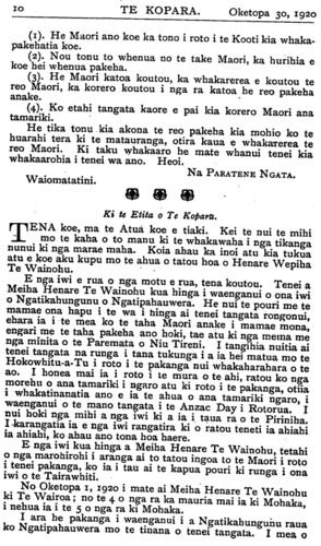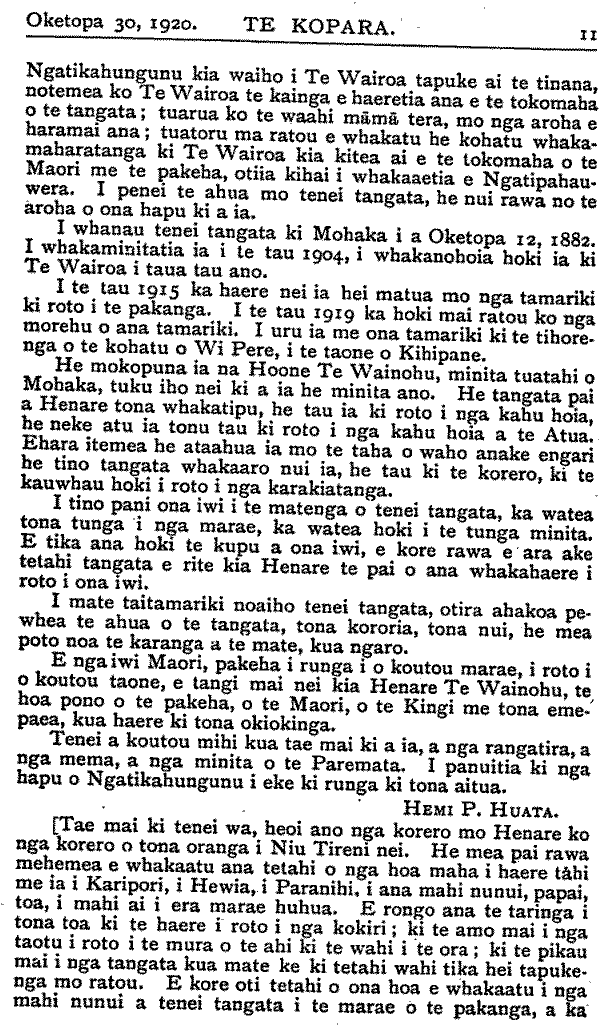 Ngatikahungunu kia waiho i Te Wairoa tapuke ai te tinana, notemea ko Te Wairoa te kainga e haeretia ana e te tokomaha o te tangata; tuarua ko te waahi mema tera, mo nga aroha e haramai ana; tuatoru ma ratou e whakatu he kohatu whakamaharatanga ki Te Wairoa kia kitea ai e te tokomaha o te Maori me te pakeha, otiia kihai i whakaaetia e Ngatipahauwera. I penei te ahua mo tenei tangata, he nui rawa no te aroha o ona hapu ki a ia. I whanau tenei tangata ki Mohaka i a Oketopa 12, 1882. I whakaminitatia ia i te tau 1904, i whakanohoia hoki ia ki Te Wairoa i taua tau ano. I te tau 1915 ka haere nei ia hei matua mo nga tamariki ki roto i te pakanga. I te tau 1919 ka hoki mai ratou ko nga morehu o ana tamariki. I uru ia me ona tamariki ki te tihorenga o te kohatu o Wi Pere, i te taone o Kihipane. He mokopuna ia na Hoone Te Wainohu, minita tuatahi o Mohaka, taku iho nei ki a ia he minita ano. He tangata pai a Henare tona whakatipu, he tau ia ki roto i nga kahu hoia, he neke atu ia tonu tau ki roto i nga kahu hoia a te Atua. Ehara itemea he ataahua ia mo te taha o waho anake engari he tino tangata whakaaro nui ia, he tau ki te korero, ki te kauwhau hoki i roto i nga karakiatanga. I tino pani ona iwi i te matenga o tenei tangata, ka watea tona tunga i nga marae, ka watea hoki i te tunga minita. E tika ana hoki te kupu a ona iwi, e kore rawa e ara ake tetahi tangata e rite kia Henare te pai o ana whakahaere i roto i ona iwi. I mate taitamariki noaiho tenei tangata, otira ahakoa pewhea te ahua o te tangata, tona kororia, tona nui, he mea poto noa te karanga a te mate, kua ngaro. E nga iwi Maori, pakeha i runga i o koutou marae, i roto i o koutou taone, e tangi mai nei kia Henare Te Wainohu, te hoa pono o te pakeha, o te Maori, o te Kingi me tona emepaea, kua haere ki tona okiokinga. Tenei a koutou mihi kua tae mai ki a ia, a nga rangatira, a nga mema, a nga minita o te Paremata. I panuitia ki nga hapu o Ngatikahungunu i eke ki runga ki tona aitua. HEMI P. HUATA. [Tae mai ki tenei wa, heoi ano nga korero mo Henare ko nga korero o tona oranga i Niu Tireni nei. He mea pai rawa mehemea e whakaatu ana tetahi o nga hoa maha i haere tahi me ia i Karipori, i Hewia, i Paranihi, i ana mahi nunui, papai, toa, i mahi ai i era marae huhua. E rongo ana te taringa i tona toa ki te haere i roto i nga kokiri; ki te amo mai i nga taotu i roto i te mura o te ahi ki te wahi i te ora; ki te pikau mai i nga tangata kua mate ke ki tetahi wahi tika hei tapukenga mo ratou. E kore oti tetahi o ona hoa e whakaatu i nga mahi nunui a tenei tangata i te marae o te pakanga, a ka