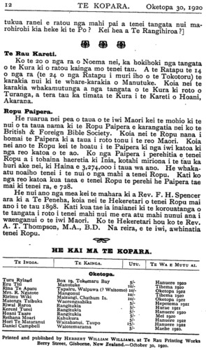 tukua ranei e ratou nga mahi pai a tenei tangata nui marohirohi kia heke ki te Po? Kei hea a Te Rangihiroa?] Te Rau Kareti. Ko te 20 o nga ra o Noema nei, ka hokihoki nga tangata o te Kura ki o ratou kainga mo tenei tau. A te Ratapu te 14 o nga ra (te 24 o nga Ratapu i muri iho o te Tokotoru) te karakia nui ki te whare-karakia o Manutuke. Koia nei te karakia whakamutunga a nga tangata o te Kura ki roto o Turanga, a tera tau ka timata te Kura i te Kareti o Hoani, Akarana. Ropu Paipera. He ruarua nei pea o taua o te iwi Maori kei te mohio ki te nui o ta taua nama ki te Ropu Paipera e karangatia nei ko te British & Foreign Bible Society. Koia nei te Ropu nana i homai te Paipera ki a taua i roto tonu i te reo Maori. Koia nei ano te Ropu kei te hoatu i te Paipera ki nga iwi katoa ki nga reo katoa o te ao. Ko nga Paipera i perehitia e tenei Ropu a i tohaina haeretia ki Inia, kotahi miriona i te tau ka huri ake nei, ki Haina e 3,274,000 i taua wa ano. He whakaatu noaiho tenei i te nui o nga mahi a tenei Ropu. Kati ko nga reo katoa kua taea e tenei Ropu te perehi he Paipera tae mai ki tenei ra, e 728. He nui ano nga mea kei te mahara ki a Rev. F. H. Spencer ara ki a Te Peneha, koia nei te Hekeretari o tenei Ropu mai ano i te tau 1898. Kati kua tae ia inaianei ki te korouatanga te tangata i roto i tenei mahi nui me era atu mahi nunui ana i waenganui o te iwi Maori. Ko te Hekeretari hou ko te Rev. A. T. Thompson, M.A., B.D. Na reira, e te iwi, awhinatia tenei Ropu. HE KAI MA TE KOPARA. TE INGOA. TE KAINGA. UTU. TE WA E MUTU AI. Oketopa. Turu Ryland Box 19, Tokomaru Bay 5/- Hanuere 1920 Eru Titi Manutuke 10/- Tihema 1920 Rina Te Apatu Tapairu, Waipawa (? Waitomo) 10/- Oketopa 1922 Mrs. R. Ngatote Mangonui 10/- Tihema 1920 Ririmu Wiki Mairangi, Chatham Is. 10/- Oketopa 1922 Matenga Taihuka Waerengaahika 5/- Hepetema 1921 Riwai Raroa Rangitukia 5/- Hurae 1921 Kereni Turei Rangitukia 5/- Hanuere 1920 Hoani Taare Rangitukia 5/- Mei 1920 Reihana Moari Kahukura 5/- Hanuere 1922 Hori Te Mataranui Waitahanui, Taupo 15/- Hanuere 1922 Daniel Campbell Waiotemarama 5/- Maehe 1920. Printed and published by HERBERT WILLIAM WILLIAMS, at Te Rau Printing Works Berry Street, Gisborne, New Zealand. - October 30, 1920.