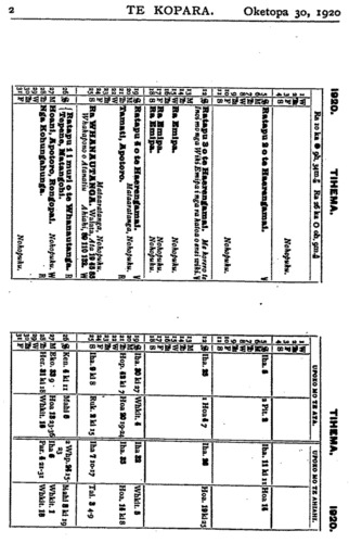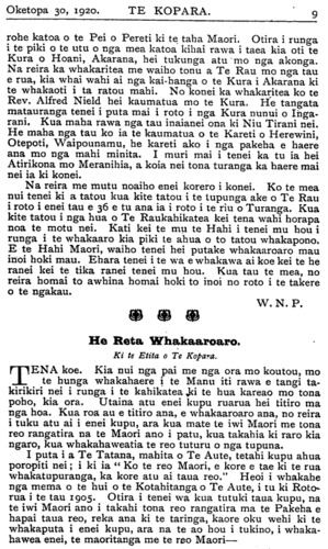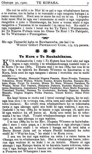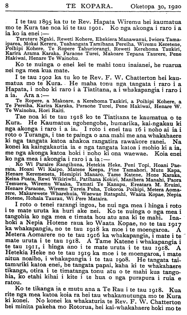 Rev. F. W. Chatterton te kaumatua tae noa ki te tau 1918. Timata mai 1919 ki tenei tau 1920, ko te Rev. A. Nield te kaumatua o te Kura. (Tana te roanga atu). Nga Kura mo te Iwi Maori. E WHAKAATU ana te ripoata a te Kawanatanga ko nga kura Maori i te tau ka huri nei, huihui katoa 119. E rua ano o enei kura kei Te Waipounamu. Ko te 117 kei Ao-tea-roa nei. Apiti ki enei kura e rima nga kura a nga Hahi. Ko nga tamariki Maori kei nga kura Pakeha hui katoa 5000. Tekau nga kura mo nga tamariki kua paahi i nga kura ririki. Hui katoa te kaute o nga tamariki kei nga Kura Maori a te Kawanatanga e 4,737. Hui katoa nga tamariki o te iwi Maori kei nga Kura Maori kei nga Kura Kawanatanga e 9,737. Ko nga tamariki i etahi wahi o te Porowini o Akarana kei te whakahengia he kore kaore e mau ana te haere ki te Kura. Me pehea a tatou tamariki e whiwhi ai ki nga matauranga ki te kore tatou nga matua e tukutuku ki te Kura. Kia manawanui tatou nga matua ki te whiu i a tatou tamariki ki te kore e rongo ki te haere ki te Kura. E ki ana Nga Whakatauki " Te tangata e kaiponu ana i tana whiu, e kino ana ia ki tana tamaiti; te tangata e aroha ana ki a ia, ka papaki wawe i a ia." Me titiro tatou ki mua. Ka ahei ranei te piki o te iwi Maori ina waiho ko ona toto rangatira anake hei whakapiki i a ia ? Ka taea ranei te piki o te Maori ki nga taumata ikeike ki te kore e whakapaua te kaha ki te kimi i te hohonutanga atu o te matauranga ? Kaore ahau i te tono kia tu katoa a tatou tamariki hei roia hei takuta hei minita hei kaiwhakaako kura ranei, engari ahakoa mahi ahuwhenua tera ano te hohonutanga atu o era matauranga. Tamariki ma, kia manawanui koutou. Kaua hei whakarerea o kontou kura kia tutuki ra no te huarahi e whaia nei e koutou. Ma to koutou kaha i enei ra o to koutou tamarikitanga e tau ai te honore ki o koutou iwi a nga tau e takoto mai nei. He Marena. No te 14 o nga ra o Hepetema ka marenatia a Rev. M. P. Kapa ki tana wahine hou, ki a Mate Henare Popata. Tino nui nga tangata i tae kia-kite i tenei marena.