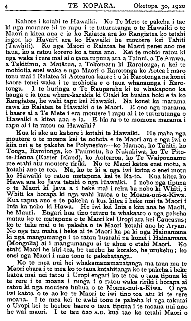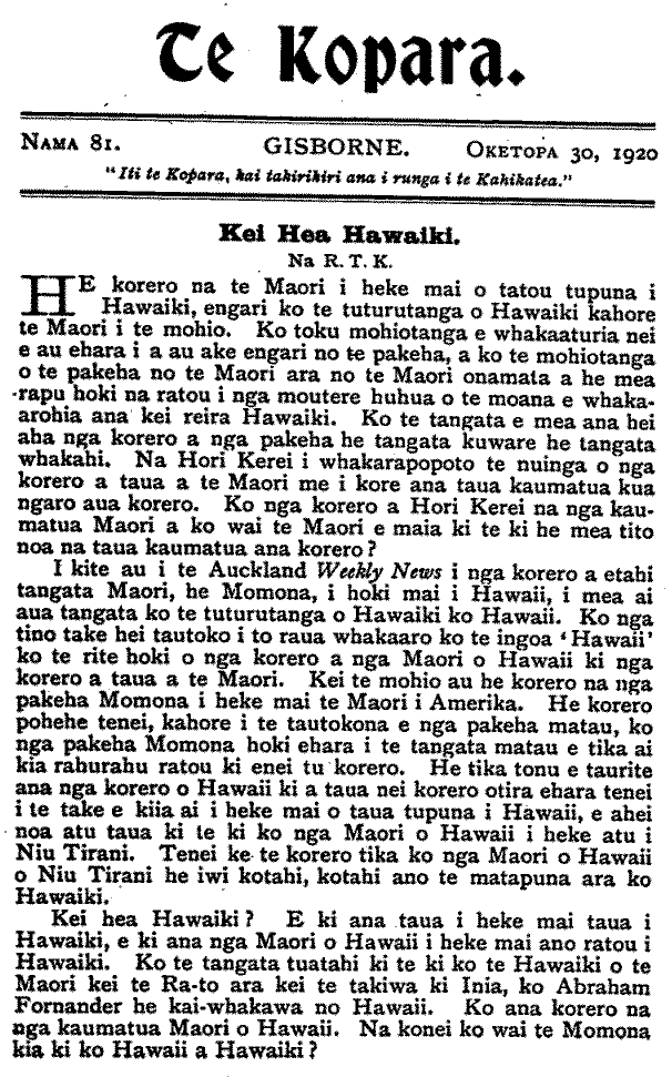 Te Kopara. GISBORNE. NAMA 81. OKETOPA 30, 1920 " Iti te Kopara, hai takirikiri ana $ runga i te Kahikatea." Kei Hea Hawaiki. Na R.T.K. HE korero na te Maori i heke mai o tatou tupuna i Hawaiki, engari ko te tuturutanga o Hawaiki kahore te Maori i te mohio. Ko toku mohiotanga e whakaaturia nei e au ehara i a au ake engari no te pakeha, a ko te mohiotanga o te pakeha no te Maori ara no te Maori onamata a he mea rapu hoki na ratou i nga moutere huhua o te moana e whakaarohia ana kei reira Hawaiki. Ko te tangata e mea ana hei aha nga korero a nga pakeha he tangata kuware he tangata whakahi. Na Hori Kerei i whakarapopoto te nuinga o nga korero a taua a te Maori me i kore ana taua kaumatua kua ngaro aua korero. Ko nga korero a Hori Kerei na nga kaumatua Maori a ko wai te Maori e maia ki te ki he mea tito noa na taua kaumatua ana korero? I kite au i te Auckland Weekly News i nga korero a etahi tangata Maori, he Momona, i hoki mai i Hawaii, i mea ai aua tangata ko te tuturutanga o Hawaiki ko Hawaii. Ko nga tino take hei tautoko i to raua whakaaro ko te ingoa 'Hawaii' ko te rite hoki o nga korero a nga Maori o Hawaii ki nga korero a taua a te Maori. Kei te mohio au he korero na nga pakeha Momona i heke mai te Maori i Amerika. He korero pohehe tenei, kahore i te tautokona e nga pakeha matau, ko nga pakeha Momona hoki ehara i te tangata matau e tika ai kia rahurahu ratou ki enei tu korero. He tika tonu e taurite ana nga korero o Hawaii ki a taua nei korero otira ehara tenei i te take e kiia ai i heke mai o taua tupuna i Hawaii, e ahei noa atu taua ki te ki ko nga Maori o Hawaii i heke atu i Niu Tirani. Tenei ke te korero tika ko nga Maori o Hawaii o Niu Tirani he iwi kotahi, kotahi ano te matapuna ara ko Hawaiki. Kei hea Hawaiki? E ki ana taua i heke mai taua i Hawaiki, e ki ana nga Maori o Hawaii i heke mai ano ratou i Hawaiki. Ko te tangata tuatahi ki te ki ko te Hawaiki o te Maori kei te Ra-to ara kei te takiwa ki Inia, ko Abraham Fornander he kai-wbakawa no Hawaii. Ko ana korero na nga kaumatua Maori o Hawaii. Na konei ko wai te Momona kia ki ko Hawaii a Hawaiki?