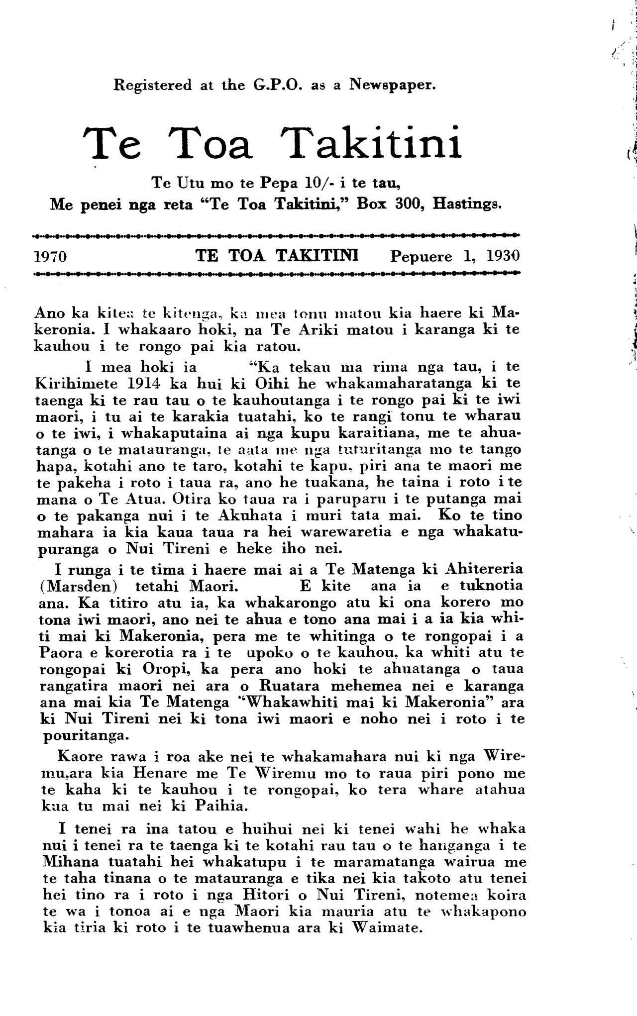 1970 TE TOA TAKITINI Pepuere 1, 1930