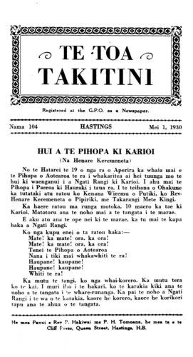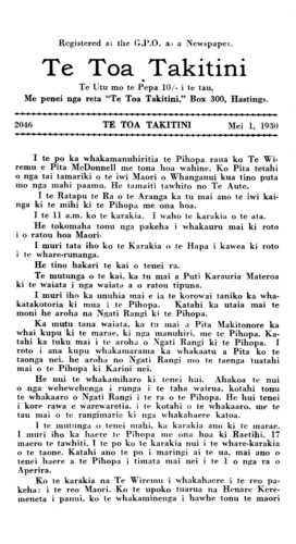 Te Toa Takitini 1921-1932: Number 104. 01 May 1930 |