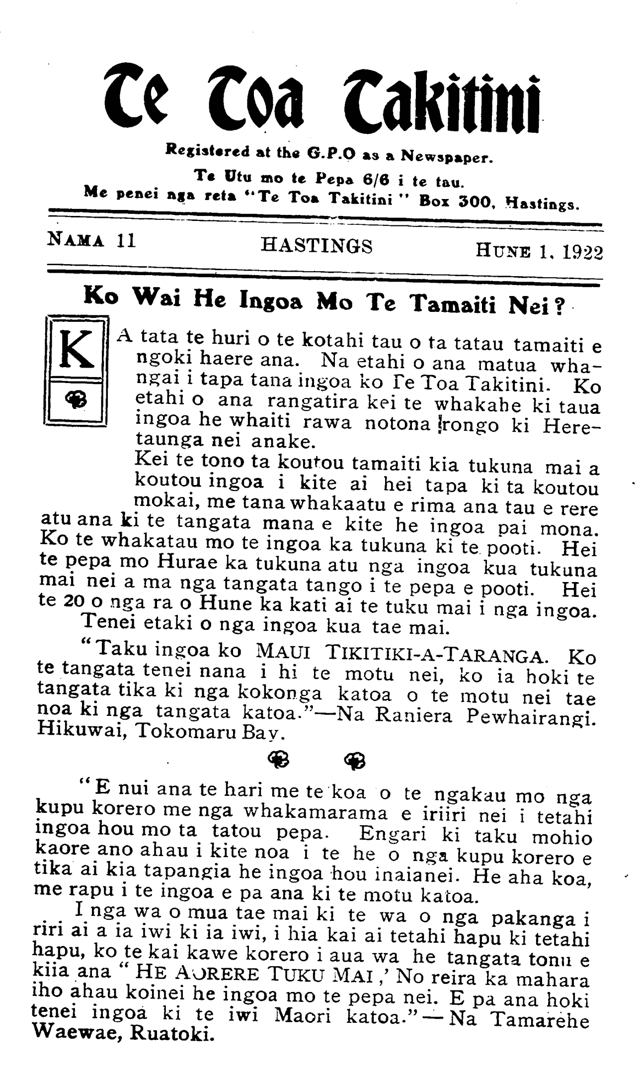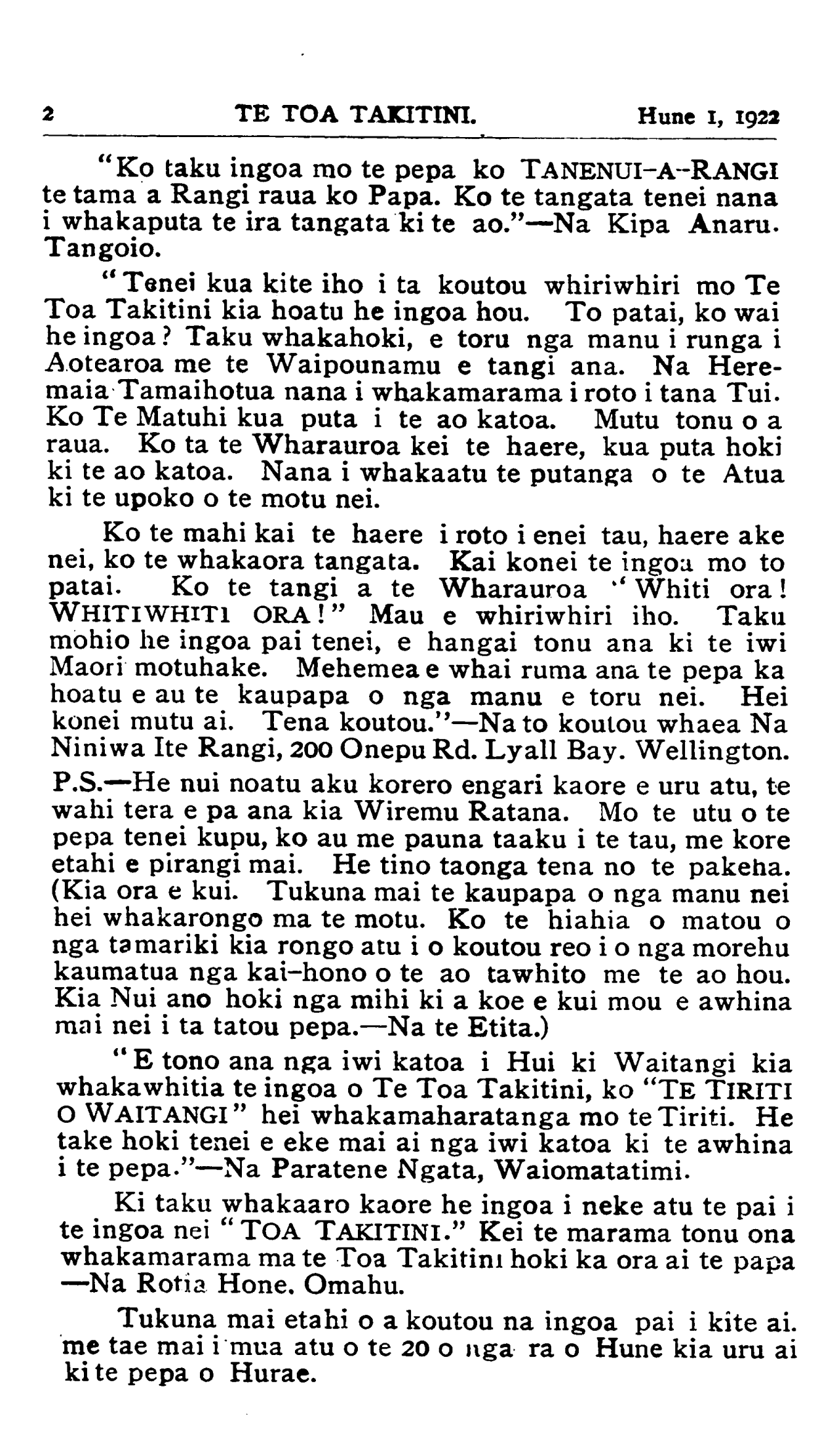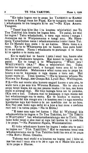2TE TOA TAKITINI. Hune 1, 1922 "Ko taku ingoa mo te pepa ko TANENUI-A-RANGI te tama a Rangi raua ko Papa. Ko te tangata tenei nana i whakaputa te ira tangata ki te ao."—Na Kipa Anaru. Tangoio. " Tenei kua kite iho i ta koutou whiriwhiri mo Te Toa Takitini kia hoatu he ingoa hou. To patai, ko wai he ingoa ? Taku whakahoki, e toru nga manu i runga i Aotearoa me te Waipounamu e tangi ana. Na Here- maia Tamaihotua nana i whakamarama i roto i tana Tui. Ko Te Matuhi kua puta i te ao katoa. Mutu tonu o a raua. Ko ta te Wharauroa kei te haere, kua puta hoki ki te ao katoa. Nana i whakaatu te putanga o te Atua ki te upoko o te motu nei. Ko te mahi kai te haere i roto i enei tau, haere ake nei, ko te whakaora tangata. Kai konei te ingoa mo to patai. Ko te tangi a te Wharauroa " Whiti ora! WHITIWHITI ORA!" Mau e whiriwhiri iho. Taku mohio he ingoa pai tenei, e hangai tonu ana ki te iwi Maori motuhake. Mehemea e whai ruma ana te pepa ka hoatu e au te kaupapa o nga manu e toru nei. Hei konei mutu ai. Tena koutou."—Na to koutou whaea Na Niniwa Ite Rangi, 20O Onepu Rd. Lyall Bay. Wellington. P.S.—He nui noatu aku korero engari kaore e uru atu, te wahi tera e pa ana kia Wiremu Ratana. Mo te utu o te pepa tenei kupu, ko au me pauna taaku i te tau, me kore etahi e pirangi mai. He tino taonga tena no te pakeha. (Kia ora e kui. Tukuna mai te kaupapa o nga manu nei hei whakarongo ma te motu. Ko te hiahia o matou o nga tamariki kia rongo atu i o koutou reo i o nga morehu kaumatua nga kai-hono o te ao tawhito me te ao hou. Kia Nui ano hoki nga mihi ki a koe e kui mou e awhina mai nei i ta tatou pepa.—Na te Etita.) " E tono ana nga iwi katoa i Hui ki Waitangi kia whakawhitia te ingoa o Te Toa Takitini, ko "TE TIRITI O WAITANGI" hei whakamaharatanga mo te Tiriti. He take hoki tenei e eke mai ai nga iwi katoa ki te awhina i te pepa."—Na Paratene Ngata, Waiomatatimi. Ki taku whakaaro kaore he ingoa i neke atu te pai i te ingoa nei " TOA TAKITINI." Kei te marama tonu ona whakamarama ma te Toa Takitini hoki ka ora ai te papa —Na Rotia Hone. Omahu. Tukuna mai etahi o a koutou na ingoa pai i kite ai. me tae mai i mua atu o te 20 o nga ra o Hune kia uru ai ki te pepa o Hurae.
