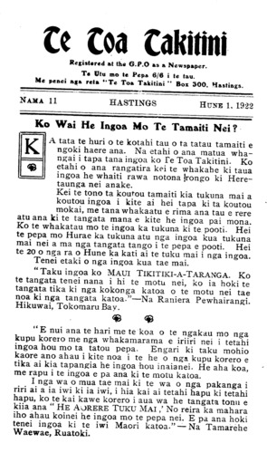 Te Toa Takitini Registered at the G.P.O as a Newspaper. Te Utu mo te Pepa 6/6 i te tau. Me penei nga reta "Te Toa Takitini " Box 300, Hastings. NAMA 11HASTINGS HUNE 1, 1922 Ko Wai He Ingoa Mo Te Tamaiti Nei? A tata te huri o te kotahi tau o ta tatau tamaiti e ngoki haere ana. Na etahi o ana matua wha- ngai i tapa tana ingoa ko Te Toa Takitini. Ko etahi o ana rangatira kei te whakahe ki taua ingoa he whaiti rawa notona rongo ki Here- taunga nei anake. Kei te tono ta koutou tamaiti kia tukuna mai a koutou ingoa i kite ai hei tapa ki ta koutou mokai, me tana whakaatu e rima ana tau e rere atu ana ki te tangata mana e kite he ingoa pai mona. Ko te whakatau mo te ingoa ka tukuna ki te pooti. Hei te pepa mo Hurae ka tukuna atu nga ingoa kua tukuna mai nei a ma nga tangata tango i te pepa e pooti. Hei te 20 o nga ra o Hune ka kati ai te tuku mai i nga ingoa. Tenei etaki o nga ingoa kua tae mai. "Taku ingoa ko MAUI TIKITIKI-A-TARANGA. Ko te tangata tenei nana i hi te motu nei, ko ia hoki te tangata tika ki nga kokonga katoa o te motu nei tae noa ki nga tangata katoa." — Na Raniera Pewhairangi. Hikuwai, Tokomaru Bay. "E nui ana te hari me te koa o te ngakau mo nga kupu korero me nga whakamarama e iriiri nei i tetahi ingoa hou mo ta tatou pepa. Engari ki taku mohio kaore ano ahau i kite noa i te he o nga kupu korero e tika ai kia tapangia he ingoa hou inaianei. He aha koa, me rapu i te ingoa e pa ana ki te motu katoa. I nga wa o mua tae mai ki te wa o nga pakanga i riri ai a ia iwi ki ia iwi, i hia kai ai tetahi hapu ki tetahi hapu, ko te kai kawe korero i aua wa he tangata tonu e kiia ana " HE AORERE TUKU MAI ,' No reira ka mahara iho ahau koinei he ingoa mo te pepa nei. E pa ana hoki tenei ingoa ki te iwi Maori katoa." — Na Tamarehe Waewae, Ruatoki.