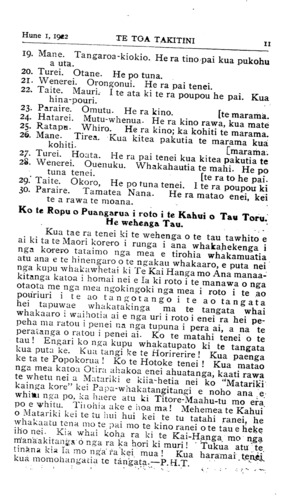 Hune 1, 1922TE TOA TAKITINI 13 tira katoa e hangai ana ki ta te Maori whakahaere mo runga i enei tu whakahaere. Na reira i tika ai tenei mihi na "E koro kia ora koe me tou hapu katoa ! Nahau te ngahuru, ngahuru noatu ! " E ki ana kei Nga Whakata- uki a Horomona:—"Te Ingoa pai, pai atu i te hiriwa i te koura ! " Ko te kupu whakamutunga a taua Kauma- tua i te tapaetanga atu i nga taonga i penei:—"Ina tae ki te takiwa e mate ai koe i te kai a ka mahara hoko koe i enei taonga, hoki mai ki au ka hoatu e au te wariu e whakaekea e koe ki runga i enei taonga ahakoa pehea te nui. Kaati maku ko te tumanako. Kei a koe te kanohi e kite ana me te maramatanga.', Enei kupu e te iwi he tino hohonu i puta ake i roto i te ngakau mamae kia koutou ki nga mea i honea e te rau o te patu. Ahakoa nga mihi mo koutou i roto i enei ra ko te koingo me whakatutu atu ki nga hau e wha, he muri aroha hei taunaha ki nga mea kua hori ki muri me te tumanako kia tere mai te ra e huihui a ai nga kaha hei Toa Takitini mo nga mea e puta ai he koha ki te iwi he honore hoki ki to tatou Kai-hanga. MO TE MARAMATAKA MAORI. Ki te Kai-tuhituhi o te Maramataka i roto i te Toa Takitini. E hoa tena koe. Tenei te maioha atu nei ki a koe e whai nei koe i nga tapuwae o nga koeke, i nga huanui o Nehe ma. E kite ana ahau ko koe te Tohunga koko- rangi o Te Toa Takitini, kei a koe te wananga o te tatai arorangi, te oha a nga kauwheke o raurangi. E tata ana te Kura a Taininihi te ngaro, i te mea kua urumaotatia nga huanui i takahia e nga kaumatua i a ratou e ora ana i te-ao-turoa. Ki taku titiro i timata te Haratua i te 28 o nga po o Aperira, na ko te tahi o Pipiri ka timata i te 27 o nga ra o Mei. He tika ranei taku ? Engari hei tewhea wa o te marama ka kitea tuatahitia a Matariki i te atapo—kei waenganui pea o nga ra o Mei. Na ki te kitea a Mata- riki, he tiaki pea te mahi i te kohititanga o te marama hou, ara i te Whiro, katahi ka timata te Tahi o Pipiri. E hoa, tetahi mea kaore i marama ki a au, ko nga wahanga o te kaupeka nei, ko Maukahau, ko Tararau- atea, ko Papawhakatangi-tangi ko Titore-mahutu. He