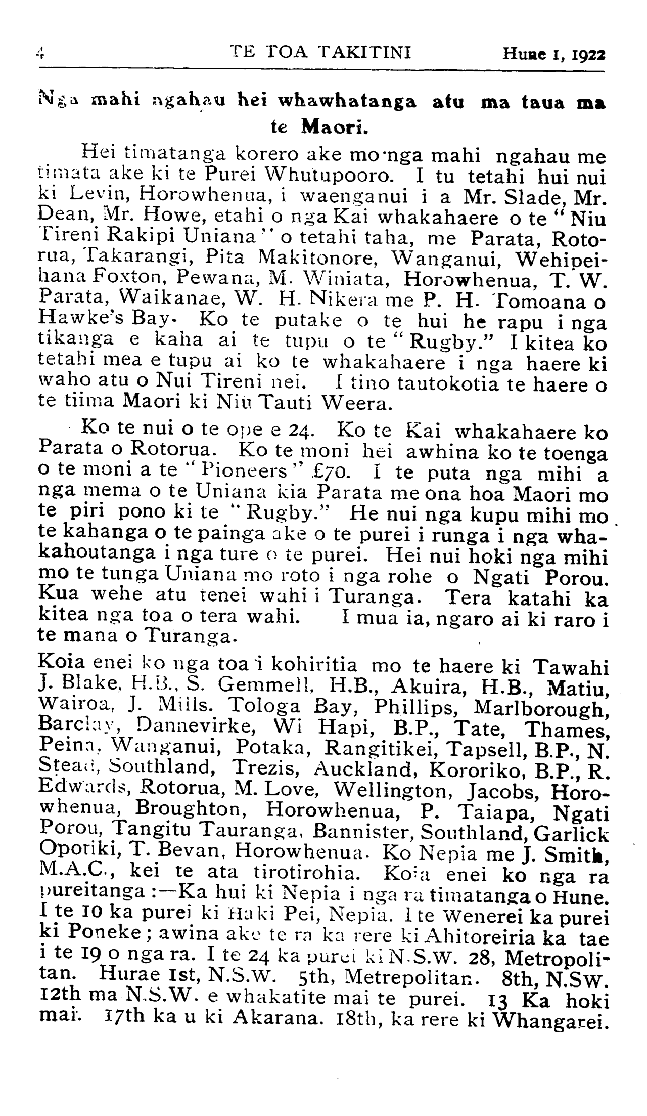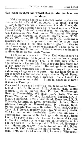 TE TOA TAKITINIHune 1, 1922 Nga mahi ngahau hei whawhatanga atu ma taua ma te Maori. Hei timatanga korero ake mo nga mahi ngahau me timata ake ki te Purei Whutupooro. I tu tetahi hui nui ki Levin, Horowhenua, i waenganui i a Mr. Slade, Mr. Dean, Mr. Howe, etahi o nga Kai whakahaere o te " Niu Tireni Rakipi Uniana " o tetahi taha, me Parata, Roto- rua, Takarangi, Pita Makitonore, Wanganui, Wehipei- hana Foxton, Pewana, M. Winiata, Horowhenua, T. W. Parata, Waikanae, W. H. Nikera me P. H. Tomoana o Hawke's Bay. Ko te putake o te hui he rapu i nga tikanga e kaha ai te tupu o te " Rugby." I kitea ko tetahi mea e tupu ai ko te whakahaere i nga haere ki waho atu o Nui Tireni nei. I tino tautokotia te haere o te tiima Maori ki Niu Tauti Weera. Ko te nui o te ope e 24. Ko te Kai whakahaere ko Parata o Rotorua. Ko te moni hei awhina ko te toenga o te moni a te " Pioneers " £70. I te puta nga mihi a nga mema o te Uniana kia Parata me ona hoa Maori mo te piri pono ki te " Rugby." He nui nga kupu mihi mo . te kahanga o te painga ake o te purei i runga i nga wha- kahoutanga i nga ture o te purei. Hei nui hoki nga mihi mo te tunga Uniana mo roto i nga rohe o Ngati Porou. Kua wehe atu tenei wahi i Turanga. Tera katahi ka kitea nga toa o tera wahi. I mua ia, ngaro ai ki raro i te mana o Turanga. Koia enei ko nga toa i kohiritia mo te haere ki Tawahi J. Blake. H.B., S. Gemmell, H.B., Akuira, H.B., Matiu, Wairoa, J. Mills. Tologa Bay, Phillips, Marlborough, Barclay, Dannevirke, Wi Hapi, B.P., Tate, Thames, Peina. Wanganui, Potaka, Rangitikei, Tapsell, B.P., N. Stead, Southland, Trezis, Auckland, Kororiko, B.P., R. Edwards, Rotorua, M. Love, Wellington, Jacobs, Horo- whenua, Broughton, Horowhenua, P. Taiapa, Ngati Porou, Tangitu Tauranga, Bannister, Southland, Garlick Oporiki, T. Bevan, Horowhenua. Ko Nepia me J. Smith, M.A.C., kei te ata tirotirohia. Koia enei ko nga ra pureitanga :—Ka hui ki Nepia i nga ra timatanga o Hune. I te IO ka purei ki Haki Pei, Nepia. I te Wenerei ka purei ki Poneke; awina ake te ra ka rere ki Ahitereiria ka tae i te 19 o nga ra. I te 24 ka purei ki N-S.W. 28, Metropoli- tan. Hurae 1st, N.S.W. 5th, Metrepolitan. 8th, N.SW. I2th ma N,S.W. e whakatite mai te purei. 13 Ka hoki mai. l7th ka u ki Akarana. l8th, ka rere ki Whangarei.