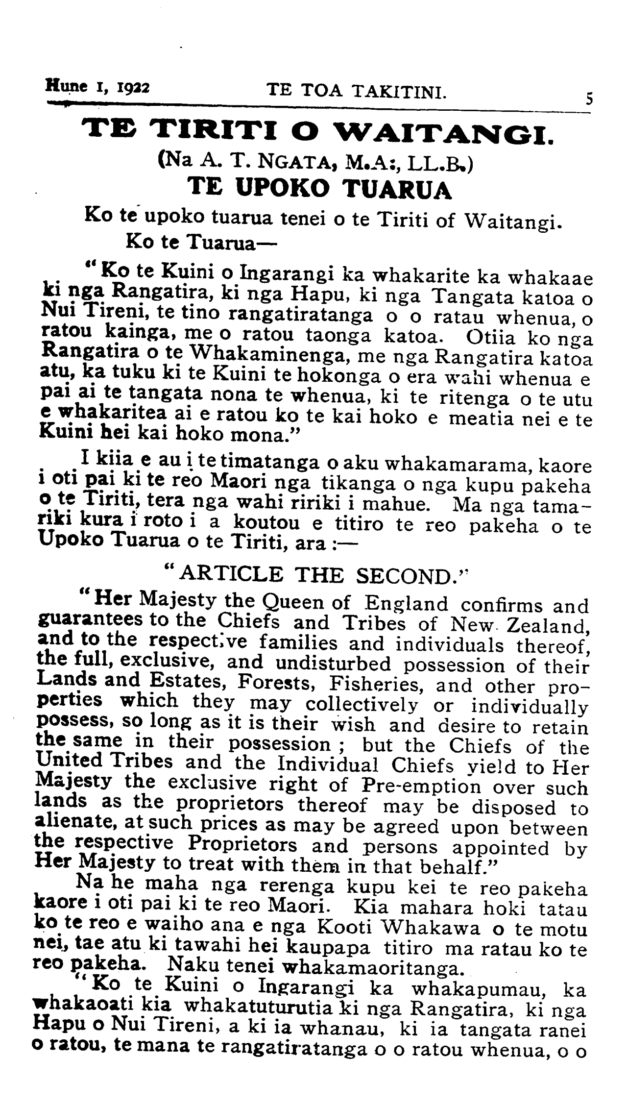Hune 1, 1922TE TOA TAKITINI. TE TIRITI O WAITANGI. (Na A. T. NGATA, M.A:, LL.B,) TE UPOKO TUARUA Ko te upoko tuarua tenei o te Tiriti of Waitangi. Ko te Tuarua — " Ko te Kuini o Ingarangi ka whakarite ka whakaae ki nga Rangatira, ki nga Hapu, ki nga Tangata katoa o Nui Tireni, te tino rangatiratanga o o ratau whenua, o ratou kainga, me o ratou taonga katoa. Otiia ko nga Rangatira o te Whakaminenga, me nga Rangatira katoa atu, ka tuku ki te Kuini te hokonga o era wahi whenua e pai ai te tangata nona te whenua, ki te ritenga o te utu e whakaritea ai e ratou ko te kai hoko e meatia nei e te Kuini hei kai hoko mona." I kiia e au i te timatanga o aku whakamarama, kaore i oti pai ki te reo Maori nga tikanga o nga kupu pakeha o te Tiriti, tera nga wahi ririki i mahue. Ma nga tama- riki kura i roto i a koutou e titiro te reo pakeha o te Upoko Tuarua o te Tiriti, ara : — "ARTICLE THE SECOND." "Her Majesty the Queen of England confirms and guarantees to the Chiefs and Tribes of New Zealand, and to the respective families and individuals thereof, the full, exclusive, and undisturbed possession of their Lands and Estates, Forests, Fisheries, and other pro- perties which they may collectively or individually possess, so long as it is their wish and desire to retain the same in their possession ; but the Chiefs of the United Tribes and the Individual Chiefs yield to Her Majesty the exclusive right of Pre-emption over such lands as the proprietors thereof may be disposed to alienate, at such prices as may be agreed upon between the respective Proprietors and persons appointed by Her Majesty to treat with them in that behalf." Na he maha nga rerenga kupu kei te reo pakeha kaore i oti pai ki te reo Maori. Kia mahara hoki tatau ko te reo e waiho ana e nga Kooti Whakawa o te motu nei, tae atu ki tawahi hei kaupapa titiro ma ratau ko te reo pakeha. Naku tenei whakamaoritanga. " Ko te Kuini o Ingarangi ka whakapumau, ka whakaoati kia whakatuturutia ki nga Rangatira, ki nga Hapu o Nui Tireni, a ki ia whanau, ki ia tangata ranei o ratou, te mana te rangatiratanga o o ratou whenua, o o