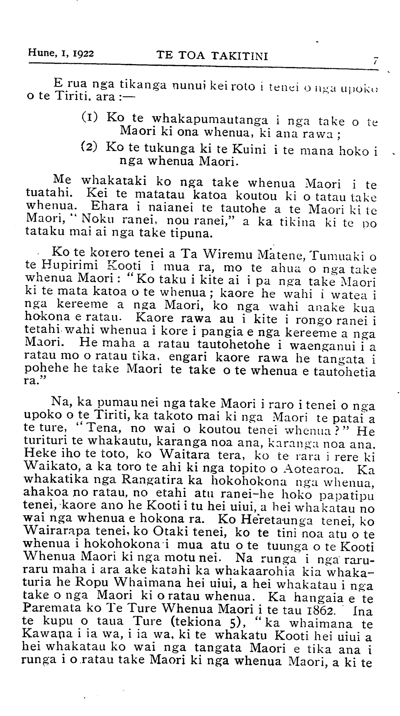Hune, 1, 1922TE TOA TAKITINI 7 E rua nga tikanga nunui kei roto i tenei o nga upoko o te Tiriti, ara :— (1) Ko te whakapumautanga i nga take o te Maori ki ona whenua, ki ana rawa ; (2) Ko te tukunga ki te Kuini i te mana hoko i nga whenua Maori. Me whakataki ko nga take whenua Maori i te tuatahi. Kei te matatau katoa koutou ki o tatau take whenua. Ehara i naianei te tautohe a te Maori ki te Maori, " Noku ranei, nou ranei," a ka tikina ki te po tataku mai ai nga take tipuna. Ko te koiero tenei a Ta Wiremu Matene, Tumuaki o te Hupirimi Kooti i mua ra, mo te ahua o nga take whenua Maori: "Ko taku i kite ai i pa nga take Maori ki te mata katoa o te whenua; kaore he wahi i watea i nga kereeme a nga Maori, ko nga wahi anake kua hokona e ratau. Kaore rawa au i kite i rongo ranei i tetahi wahi whenua i kore i pangia e nga kereeme a nga Maori. He maha a ratau tautohetohe i waenganui i a ratau mo o ratau tika, engari kaore rawa he tangata i pohehe he take Maori te take o te whenua e tautohetia ra." Na, ka pumau nei nga take Maori i raro i tenei o nga upoko o te Tiriti, ka takoto mai ki nga Maori te patai a te ture, " Tena, no wai o koutou tenei whenua ?" He turituri te whakautu, karanga noa ana, karanga noa ana. Heke iho te toto, ko Waitara tera, ko te rara i rere ki Waikato, a ka toro te ahi ki nga topito o Aotearoa. Ka whakatika nga Rangatira ka hokohokona nga whenua, ahakoa no ratau, no etahi atu ranei-he hoko papatipu tenei, kaore ano he Kooti i tu hei uiui, a hei whakatau no wai nga whenua e hokona ra. Ko Heretaunga tenei, ko Wairarapa tenei, ko Otaki tenei, ko te tini noa atu o te whenua i hokohokona i mua atu o te tuunga o te Kooti Whenua Maori ki nga motu nei. Na runga i nga raru- raru maha i ara ake katahi ka whakaarohia kia whaka- turia he Ropu Whaimana hei uiui, a hei whakatau i nga take o nga Maori ki o ratau whenua. Ka hangaia e te Paremata ko Te Ture Whenua Maori i te tau 1862. Ina te kupu o taua Ture (tekiona 5), "ka whaimana te Kawana i ia wa, i ia wa, ki te whakatu Kooti hei uiui a hei whakatau ko wai nga tangata Maori e tika ana i runga i o ratau take Maori ki nga whenua Maori, a ki te