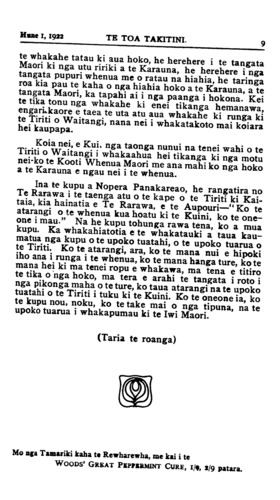 Hune 1,1922\_\_\_\_\_\_TE TOA TAKITINI.\_\_\_\_\_\_\_\_\_\_\_\_9 te whakahe tatau ki aua hoko, he herehere i te tangata Maori ki nga utu ririki a te Karauna, he herehere i nga tangata pupuri whenua me o ratau na hiahia, he taringa roa kia pau te kaha o nga hiahia hoko a te Karauna, a te tangata Maori, ka tapahi ai i nga paanga i hokona. Kei te tika tonu nga whakahe ki enei tikanga hemanawa, engari kaore e taea te uta atu aua whakahe ki runga ki te Tiriti o Waitangi, nana nei i whakatakoto mai koiara hei kaupapa. Koia nei, e Kui, nga taonga nunui na tenei wahi o te Tiriti o Waitangi i whakaahua hei tikanga ki nga motu nei-ko te Kooti Whenua Maori me ana mahi ko nga hoko a te Karauna e ngau hei i te whenua. Ina te kupu a Nopera Panakareao, he rangatira no Te Rarawa i te taenga atu o te kape o te Tiriti ki Kai- taia, kia hainatia e Te Rarawa, e te Aupouri—" Ko te atarangi o te whenua kua hoatu ki te Kuini, ko te one- one i mau." Na he kupu tohunga rawa tena, ko a mua kupu. Ka whakahiatotia e te whakatauki a taua kau- matua nga kupu o te upoko tuatahi, o te upoko tuarua o te Tiriti. Ko te atarangi, ara, ko te mana nui e hipoki iho ana i runga i te whenua, ko te mana hanga ture, ko te mana hei ki ma tenei ropu e whakawa, ma tena e titiro te tika o nga hoko, ma tera e arahi te tangata i roto i nga pikonga maha o te ture, ko taua atarangi na te upoko tuatahi o te Tiriti i tuku ki te Kuini. Ko te oneone ia. ko te kupu nou, noku, ko te take mai o nga tipuna, na te upoko tuarua i whakapumau ki te Iwi Maori. (Taria te roanga) Mo nga Tamariki kaha te Rewharewha, me kai i te WOODS' GREAT PEPPERMINT CURE, 1/9, 2/9 patara.