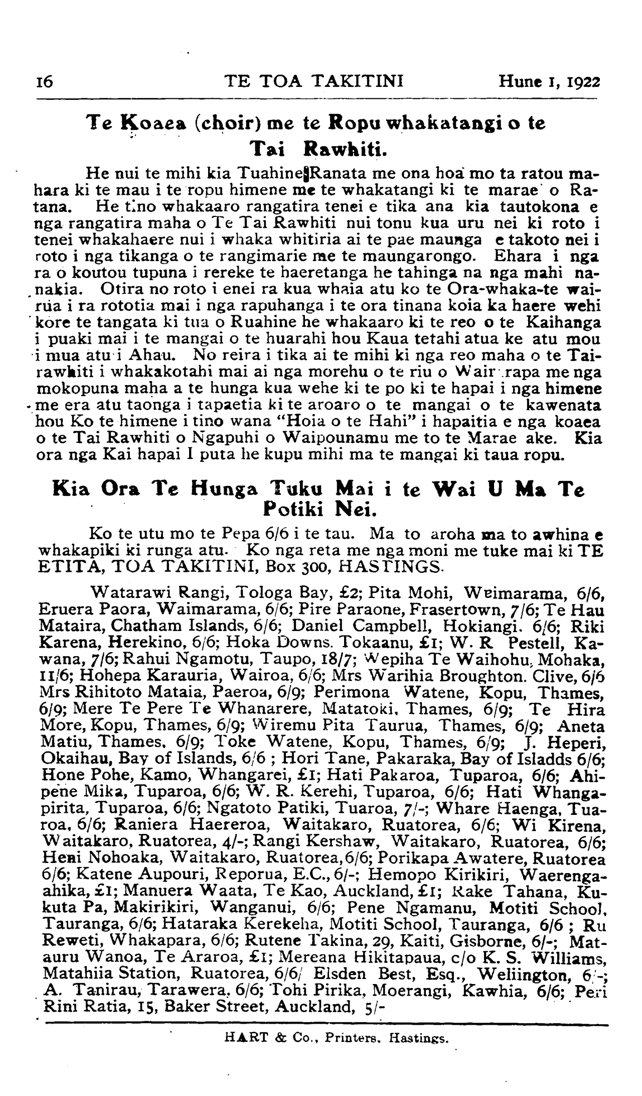 auru Wanoa, Te Araroa, £1; Mereana Hikitapaua, c/o K. S. Williams,