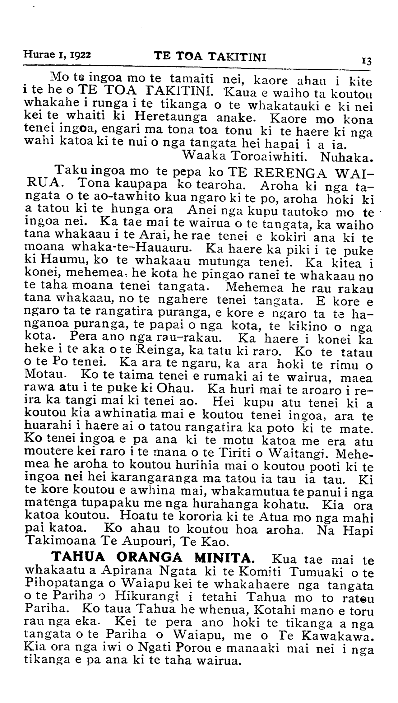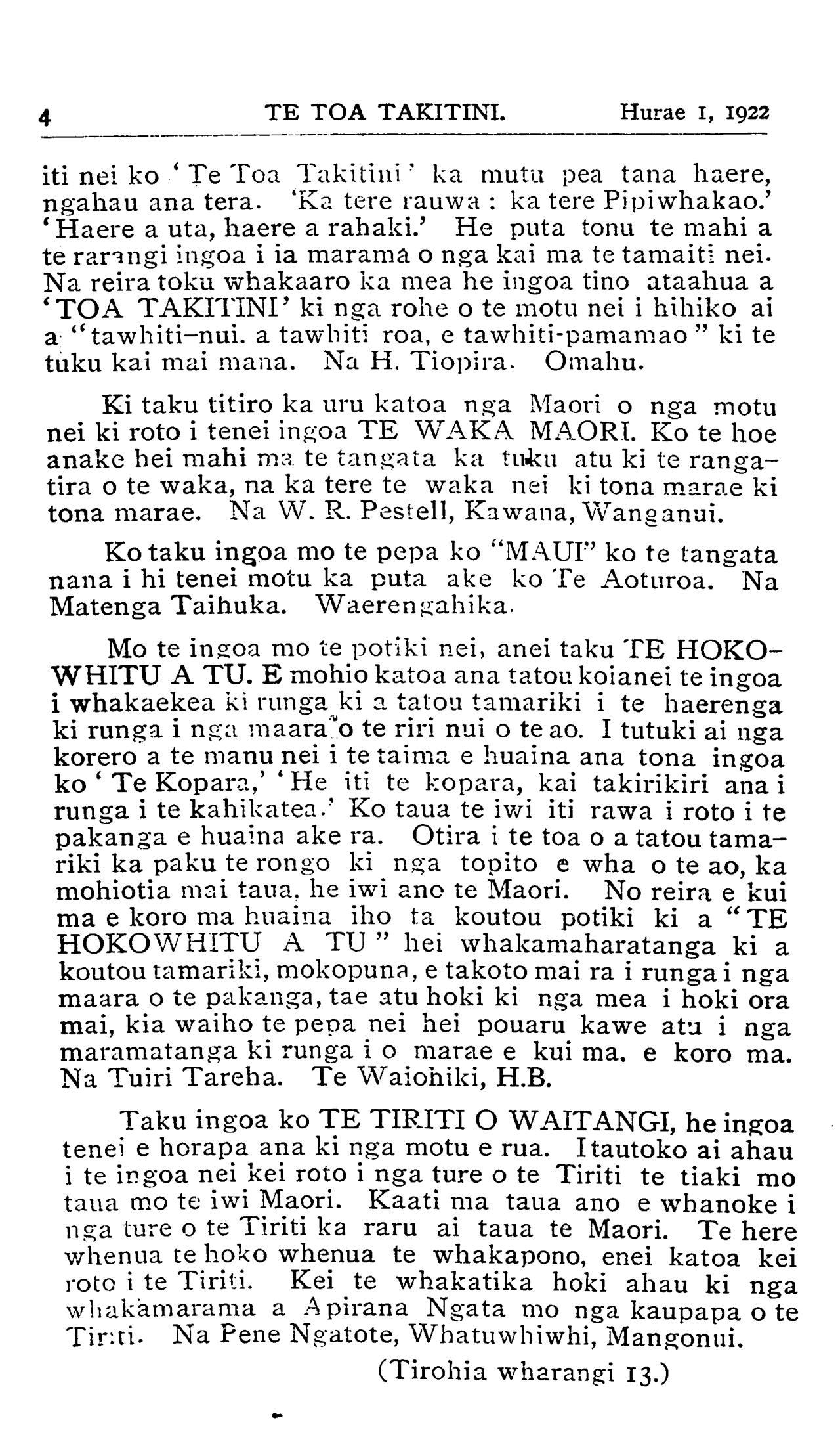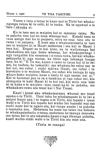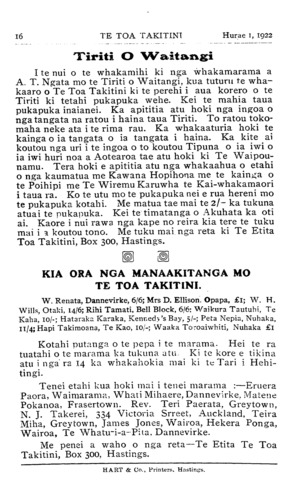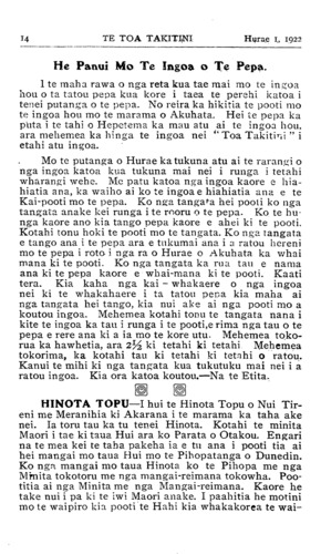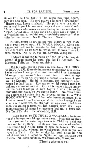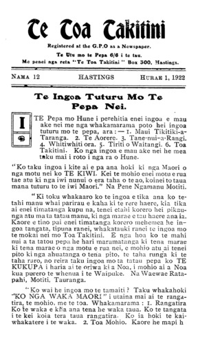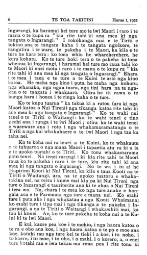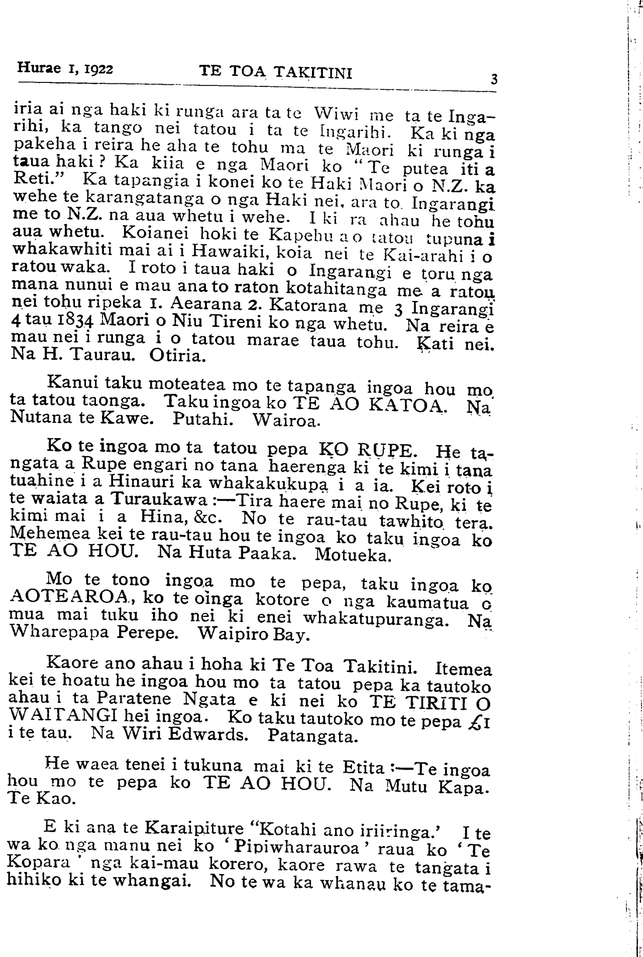 TE TOA TAKITINI.Hurae 1, 1922 iti nei ko •' Te Toa Takitini' ka mutu pea tana haere, ngahau ana tera. 'Ka tere rauwa : ka tere Pipi whakao.' ' Haere a uta, haere a rahaki.' He puta tonu te mahi a te rarangi ingoa i ia marama o nga kai ma te tamaiti nei. Na reira toku whakaaro ka mea he ingoa tino ataahua a 'TOA TAKITINI' ki nga rohe o te motu nei i hihiko ai a "tawhiti-nui. a tawhiti roa, e tawhiti-pamamao " ki te tuku kai mai mana. Na H. Tiopira. Omahu. Ki taku titiro ka uru katoa nga Maori o nga motu nei ki roto i tenei ingoa TE WAKA MAORI. Ko te hoe anake hei mahi ma te tangata ka tuku atu ki te ranga- tira o te waka, na ka tere te waka nei ki tona marae ki tona marae. Na W. R. Pestell, Kawana, Wanganui. Ko taku ingoa mo te pepa ko "MAUI" ko te tangata nana i hi tenei motu ka puta ake ko Te Aoturoa. Na Matenga Taihuka. Waerengahika. Mo te ingoa mo te potiki nei, anei taku TE HOKO- WHITU A TU. E mohio katoa ana tatou koianei te ingoa i whakaekea ki runga ki a tatou tamariki i te haerenga ki runga i nga maara o te riri nui o te ao. I tutuki ai nga korero a te manu nei i te taima e huaina ana tona ingoa ko ' Te Kopara, ' He iti te kopara, kai takirikiri ana i runga i te kahikatea.' Ko taua te iwi iti rawa i roto i te pakanga e huaina ake ra. Otira i te toa o a tatou tama- riki ka paku te rongo ki nga topito e wha o te ao, ka mohiotia mai taua, he iwi ano te Maori. No reira e kui ma e koro ma huaina iho ta koutou potiki ki a " TE HOKOWHITU A TU " hei whakamaharatanga ki a koutou tamariki, mokopuna, e takoto mai ra i runga i nga maara o te pakanga, tae atu hoki ki nga mea i hoki ora mai, kia waiho te pepa nei hei pouaru kawe atu i nga maramatanga ki runga i o marae e kui ma. e koro ma. Na Tuiri Tareha. Te Waiohiki, H.B. Taku ingoa ko TE TIRITI O WAITANGI, he ingoa tenei e horapa ana ki nga motu e rua. I tautoko ai ahau i te ingoa nei kei roto i nga ture o te Tiriti te tiaki mo taua mo te iwi Maori. Kaati ma taua ano e whanoke i nga ture o te Tiriti ka raru ai taua te Maori. Te here whenua te hoko whenua te whakapono, enei katoa kei roto i te Tiriti. Kei te whakatika hoki ahau ki nga whakamarama a Apirana Ngata mo nga kaupapa o te Tiriti. Na Pene Ngatote, Whatuwhiwhi, Mangonui. (Tirohia wharangi 13.)