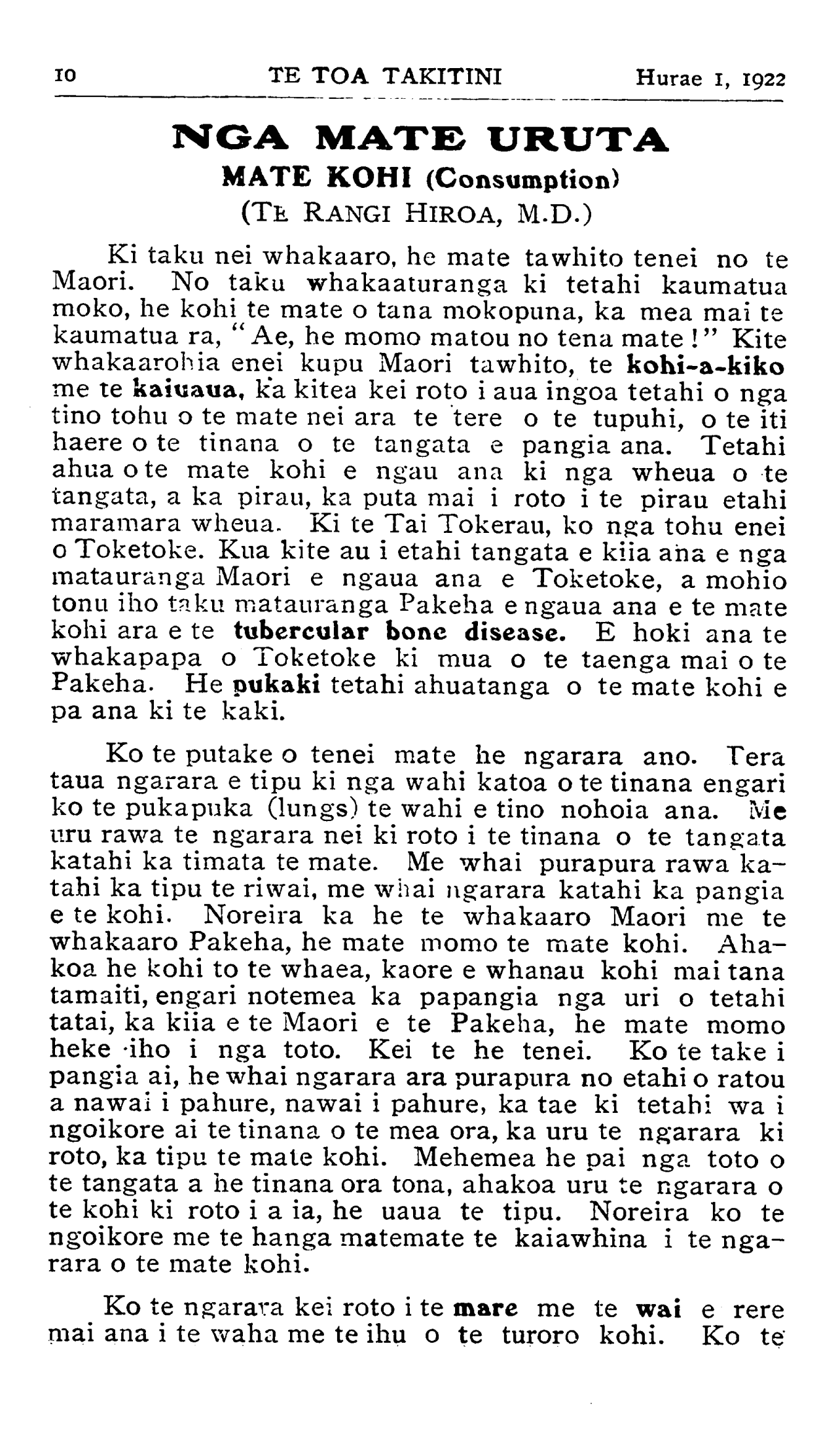 10TE TOA TAKITINI Hurae 1, 1922 NOA MATE URUTA MATE KOHI (Consumption) (TE RANGI HIROA, M.D.) Ki taku nei whakaaro, he mate tawhito tenei no te Maori. No taku whakaaturanga ki tetahi kaumatua moko, he kohi te mate o tana mokopuna, ka mea mai te kaumatua ra, "Ae, he momo matou no tena mate !" Kite whakaarohia enei kupu Maori tawhito, te kohi-a-kiko me te kaiuaua, ka kitea kei roto i aua ingoa tetahi o nga tino tohu o te mate nei ara te tere o te tupuhi, o te iti haere o te tinana o te tangata e pangia ana. Tetahi ahua o te mate kohi e ngau ana ki nga wheua o te tangata, a ka pirau, ka puta mai i roto i te pirau etahi maramara wheua. Ki te Tai Tokerau, ko nga tohu enei o Toketoke. Kua kite au i etahi tangata e kiia aha e nga matauranga Maori e ngaua ana e Toketoke, a mohio tonu iho taku matauranga Pakeha e ngaua ana e te mate kohi ara e te tubercular bone disease. E hoki ana te whakapapa o Toketoke ki mua o te taenga mai o te Pakeha. He pukaki tetahi ahuatanga o te mate kohi e pa ana ki te kaki. Ko te putake o tenei mate he ngarara ano. Tera taua ngarara e tipu ki nga wahi katoa o te tinana engari ko te pukapuka (lungs) te wahi e tino nohoia ana. Me uru rawa te ngarara nei ki roto i te tinana o te tangata katahi ka timata te mate. Me whai purapura rawa ka- tahi ka tipu te riwai, me whai ngarara katahi ka pangia e te kohi. Noreira ka he te whakaaro Maori me te whakaaro Pakeha, he mate momo te mate kohi. Aha- koa he kohi to te whaea, kaore e whanau kohi mai tana tamaiti, engari notemea ka papangia nga uri o tetahi tatai, ka kiia e te Maori e te Pakeha, he mate momo heke iho i nga toto. Kei te he tenei. Ko te take i pangia ai, he whai ngarara ara purapura no etahi o ratou a nawai i pahure, nawai i pahure, ka tae ki tetahi wa i ngoikore ai te tinana o te mea ora, ka uru te ngarara ki roto, ka tipu te mate kohi. Mehemea he pai nga toto o te tangata a he tinana ora tona, ahakoa uru te ngarara o te kohi ki roto i a ia, he uaua te tipu. Noreira ko te ngoikore me te hanga matemate te kaiawhina i te nga- rara o te mate kohi. Ko te ngarara kei roto i te mare me te wai e rere mai ana i te waha me te ihu o te turoro kohi. Ko te