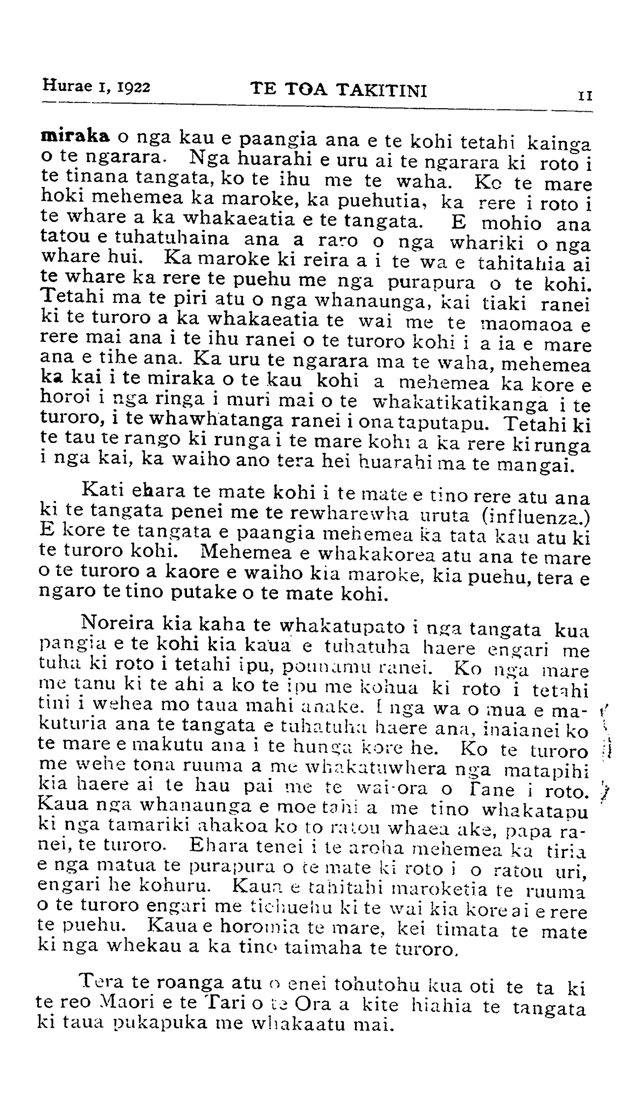 Hurae 1, 1922TE TOA TAKITINI 11 miraka o nga kau e paangia ana e te kohi tetahi kainga o te ngarara. Nga huarahi e uru ai te ngarara ki roto i te tinana tangata, ko te ihu me te waha. Ko te mare hoki mehemea ka maroke, ka puehutia, ka rere i roto i te whare a ka whakaeatia e te tangata. E mohio ana tatou e tuhatuhaina ana a raro o nga whariki o nga whare hui. Ka maroke ki reira a i te wa e tahitahia ai te whare ka rere te puehu me nga purapura o te kohi. Tetahi ma te piri atu o nga whanaunga, kai tiaki ranei ki te turoro a ka whakaeatia te wai me te maomaoa e rere mai ana i te ihu ranei o te turoro kohi i a ia e mare ana e tihe ana. Ka uru te ngarara ma te waha, mehemea ka kai i te miraka o te kau kohi a mehemea ka kore e horoi i nga ringa i muri mai o te whakatikatikanga i te turoro, i te whawhatanga ranei i ona taputapu. Tetahi ki te tau te rango ki runga i te mare kohi a ka rere ki runga i nga kai, ka waiho ano tera hei huarahi ma te mangai. Kati ehara te mate kohi i te mate e tino rere atu ana ki te tangata penei me te rewharewha uruta (influenza.) E kore te tangata e paangia mehemea ka tata kau atu ki te turoro kohi. Mehemea e whakakorea atu ana te mare o te turoro a kaore e waiho kia maroke, kia puehu, tera e ngaro te tino putake o te mate kohi. Noreira kia kaha te whakatupato i nga tangata kua pangia e te kohi kia kaua e tuhatuha haere engari me tuha, ki roto i tetahi ipu, pounamu ranei. Ko nga mare me tanu ki te ahi a ko te ipu me kohua ki roto i tetahi tini i wehea mo taua mahi anake. I nga wa o mua e ma- kuturia ana te tangata e tuhatuha haere ana, inaianei ko te mare e makutu ana i te hunga, kore he. Ko te turoro me wehe tona ruuma a me whakatuwhera nga matapihi kia haere ai te hau pai me te wai-ora o Tane i roto. Kaua nga whanaunga e moe tahi a me tino whakatapu ki nga tamariki ahakoa ko to ratou whaea ake, papa ra- nei, te turoro. Ehara tenei i te aroha mehemea ka tiria e nga matua te purapura o te mate ki roto i o ratou uri, engari he kohuru. Kaua e tahitahi maroketia te ruuma o te turoro engari me tiehuehu ki te wai kia kore ai e rere te puehu. Kaua e horomia te mare, kei timata te mate ki nga whekau a ka tino taimaha te turoro. Tera te roanga atu o enei tohutohu kua oti te ta ki te reo Maori e te Tari o te Ora a kite hiahia te tangata ki taua pukapuka me whakaatu mai.