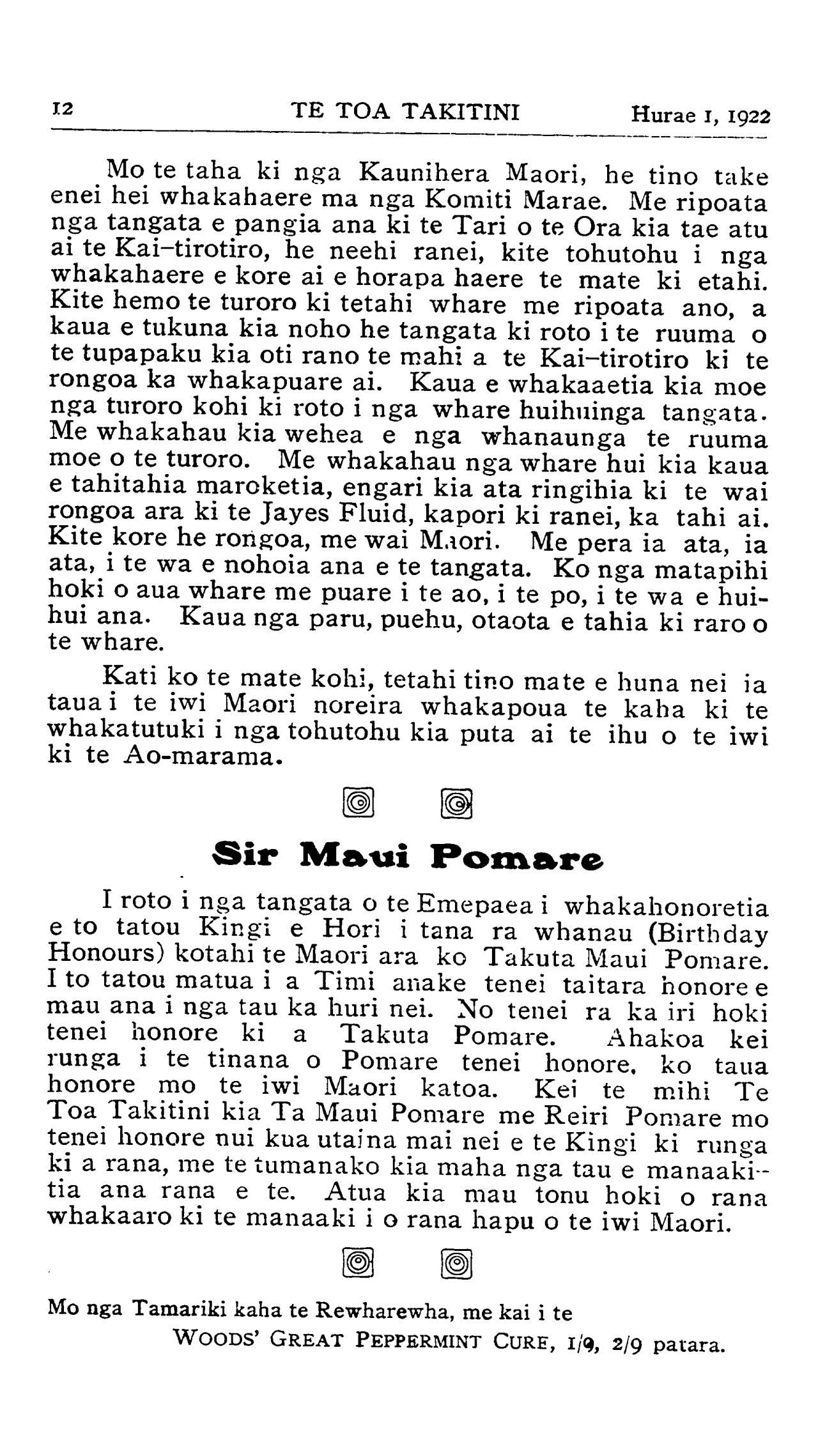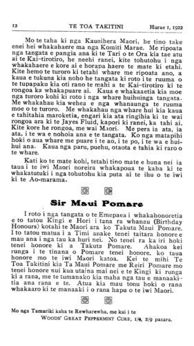 12TE TOA TAKITINI Hurae 1, 1922 Mo te taha ki nga Kaunihera Maori, he tino take enei hei whakahaere ma nga Komiti Marae. Me ripoata nga tangata e pangia ana ki te Tari o te Ora kia tae atu ai te Kai-tirotiro, he neehi ranei, kite tohutohu i nga whakahaere e kore ai e horapa haere te mate ki etahi. Kite hemo te turoro ki tetahi whare me ripoata ano, a kaua e tukuna kia noho he tangata ki roto i te ruuma o te tupapaku kia oti rano te mahi a te Kai-tirotiro ki te rongoa ka whakapuare ai. Kaua e whakaaetia kia moe nga turoro kohi ki roto i nga whare huihuinga tangata. Me whakahau kia wehea e nga whanaunga te ruuma moe o te turoro. Me whakahau nga whare hui kia kaua e tahitahia maroketia, engari kia ata ringihia ki te wai rongoa ara ki te Jayes Fluid, kapori ki ranei, ka tahi ai. Kite kore he rongoa, me wai Maori. Me pera ia ata, ia ata, i te wa e nohoia ana e te tangata. Ko nga matapihi hoki o aua whare me puare i te ao, i te po, i te wa e hui- hui ana. Kaua nga paru, puehu, otaota e tahia ki raro o te whare. Kati ko te mate kohi, tetahi tino mate e huna nei ia taua i te iwi Maori noreira whakapoua te kaha ki te whakatutuki i nga tohutohu kia puta ai te ihu o te iwi ki te Ao-marama. I roto i nga tangata o te Emepaea i whakahonoretia e to tatou Kingi e Hori i tana ra whanau (Birthday Honours) kotahi te Maori ara ko Takuta Maui Pomare. I to tatou matua i a Timi anake tenei taitara honore e mau ana i nga tau ka huri nei. No tenei ra ka iri hoki tenei honore ki a Takuta Pomare. A hakoa kei runga i te tinana o Pomare tenei honore, ko taua honore mo te iwi Maori katoa. Kei te mihi Te Toa Takitini kia Ta Maui Pomare me Reiri Pomare mo tenei honore nui kua utaina mai nei e te Kingi ki runga ki a rana, me te tumanako kia maha nga tau e manaaki- tia ana rana e te. Atua kia mau tonu hoki o rana whakaaro ki te manaaki i o rana hapu o te iwi Maori. Mo nga Tamariki kaha te Rewharewha, me kai i te WOODS' GREAT PEPPERMINT CURE, 1/9, 2/9 patara.