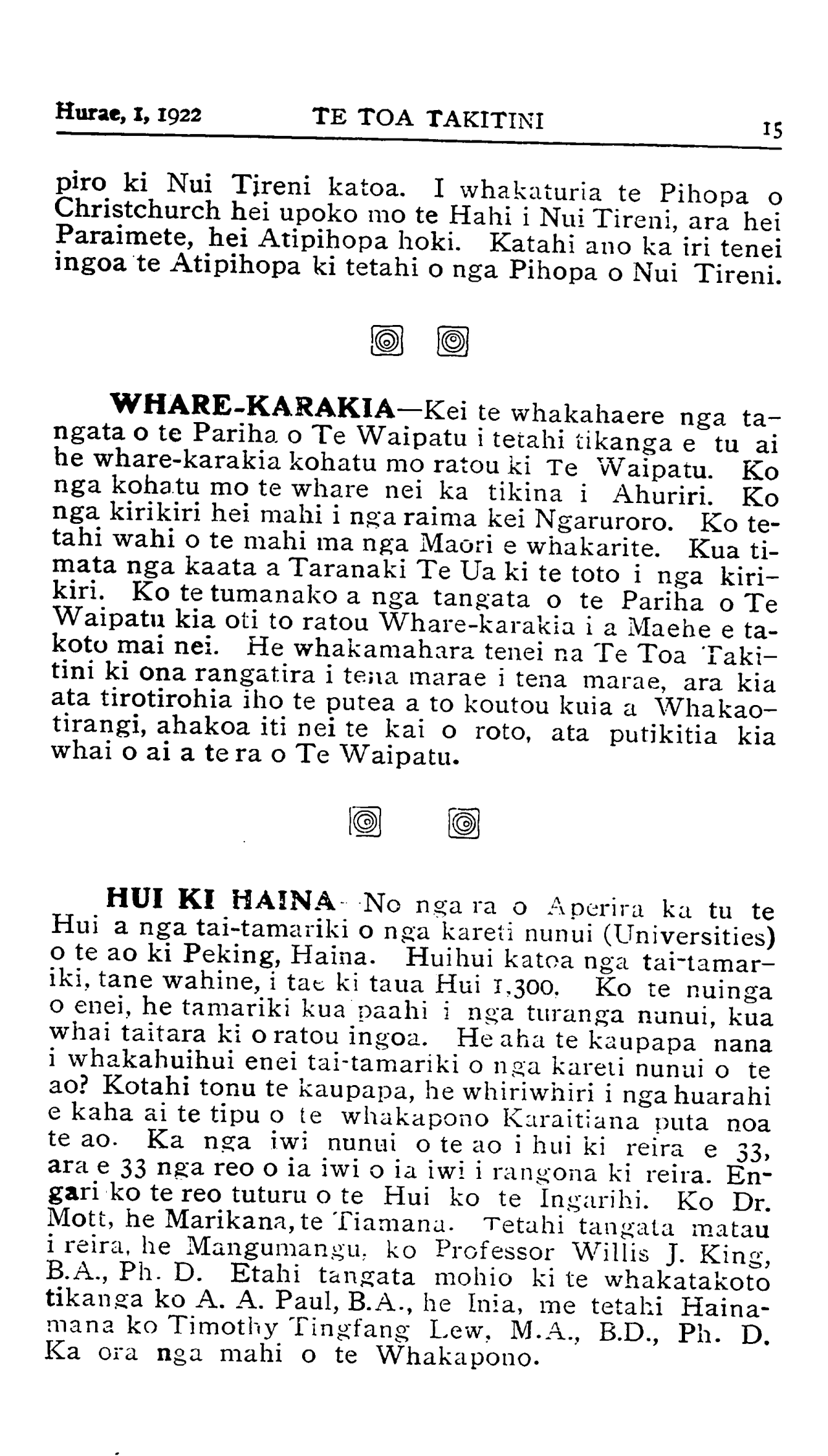 Hurae, 1,1922\_\_\_\_\_\_TE TOA TAKITINI15 piro ki Nui Tireni katoa. I whakaturia te Pihopa o Christchurch hei upoko mo te Hahi i Nui Tireni, ara hei Paraimete, hei Atipihopa hoki. Katahi ano ka iri tenei ingoa te Atipihopa ki tetahi o nga Pihopa o Nui Tireni. WHARE-KARAKIA—Kei te whakahaere nga ta- ngata o te Pariha o Te Waipatu i tetahi tikanga e tu ai he whare-karakia kohatu mo ratou ki Te Waipatu. Ko nga kohatu mo te whare nei ka tikina i Ahuriri. Ko nga kirikiri hei mahi i nga raima kei Ngaruroro. Ko te- tahi wahi o te mahi ma nga Mauri e whakarite. Kua ti- mata nga kaata a Taranaki Te Ua ki te toto i nga kiri- kiri. Ko te tumanako a nga tangata o te Pariha o Te Waipatu kia oti to ratou Whare-karakia i a Maehe e ta- koto mai nei. He whakamahara tenei na Te Toa Taki- tini ki ona rangatira i tena marae i tena marae, ara kia ata tirotirohia iho te putea a to koutou kuia a Whakao- tirangi, ahakoa iti nei te kai o roto, ata putikitia kia whai o ai a te ra o Te Waipatu. HUI KI HAINA--No nga ra o Aperira ka tu te Hui a nga tai-tamariki o nga kareti nunui (Universities) o te ao ki Peking, Haina. Huihui katoa nga tai-tamar- iki. tane wahine, i tat ki taua Hui 1,300. Ko te nuinga o enei, he tamariki kua paahi i nga turanga nunui, kua whai taitara ki o ratou ingoa. He aha te kaupapa nana i whakahuihui enei tai-tamariki o nga kareti nunui o te ao? Kotahi tonu te kaupapa, he whiriwhiri i nga huarahi e kaha ai te tipu o te whakapono Karaitiana puta noa te ao. Ka nga iwi nunui o te ao i hui ki reira e 33, ara e 33 nga reo o ia iwi o ia iwi i rangona ki reira. En- gari ko te reo tuturu o te Hui ko te Ingarihi. Ko Dr. Mott, he Marikana, te Tiamana. Tetahi tangata matau i reira, he Mangumangu, ko Professor Willis J. King, B.A., Ph. D. Etahi tangata mohio ki te whakatakoto tikanga ko A. A. Paul, B.A., he Inia, me tetahi Haina- mana ko Timothy Tingfang Lew, M.A., B.D., Ph. D. Ka ora nga mahi o te Whakapono.