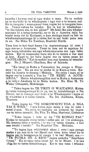 TE TOA TAKITINIHurae 1, 1922 kapehu i kawea mai ai nga waka o mua. Na te mohio na te toa hoki ki te whakaputa i nga rire o te moana nui. Ko te tangata i waenganui tona ingoa ko te tangata hau- tu. Taana rakau he taiaha. Ko ia kei te whakahau : "te ihu takoto atu, te kei akina!" Me hoki iho aku whaka- marama ki a tatau tamariki, no te 25 o Aperira 1915 ka huaki tana riri ki Karipori, a kua meinga tenei ra hei ra whakamaharatanga ki a ratou hei ra nui hoki puta noa te ao. Na Mika Te Tawhao, Ruatoki North. Tena koe te kai-hari haere i te maramatanga ki roto i nga marae o Aotearoa. Tenei te koa nei te ngakau ki nga kupu tohutohu me nga whakamarama mo nga take katoa. Kei te tumanako tonu atu ki te meera e tae mai ai koe. Kaati ra ko taku ingoa mo ta tatou pepa ko "AOTEAROA." Kei te mohio noa mai koutou ki tenei in- goa. Na J. Heperi, Okaihau, Bay of Islands. "Ka tangi te Rehu a Tutanekai ka rongo a Hine- moa i te po. Ka pa mai te aroha ki te Kare-a-roto. Ka- tahi ka kauria te moana i Mokoia. No reira i tapa ai te ingoa mo te tamaiti a Toa ko "TE REHU A AOTE- AROA." Hoira whakatangihia mai te Rehu a Aotearoa a te tahi o Akuhata ki te Motu katoa. Na Hau H. Te Wake. Omapere, Hokianga. " Taku ingoa ko TE TIRITI O WAITANGI. Koina ta tatou maungarongo ki te ao, me te kotahitanga o Nu Tireni, me te taenga mai hoki o te Whakapono i muta ai te whawhai a o tatou tipuna. Na Ira Anihana, Kopu, Thames. Taku ingoa ko "TE HOKOWHITU TOA A NGA TAI E WHA." I uru katoa nga motu e rua ki roto i tenei ingoa. Na reira ka mahara au koianei he ingoa mo ta tatou tamaiti. Na Pita Te Hau, Muriwai, Gisborne "Taku ingoa i kite ai ko "TE RONGO PAI." Koina te tangata nana tatou i noho pai ai i te aiotanga. Ma koutou tonu e mohio, i te wa i o tatou tipuna, e kai ana tetahi i tetahi." Na Ropitini Tio. Mohaka. "Te ingoa kua whiriwhiri ahau i roto i nga panga maha e pa ana ki te iwi Maori nui tonu koia tenei ko te ingoa pai te horapanga ki runga i te iwi Maori, ara:— " TE PUTEA ITI A RETI " ingoa pakeha " Southern Cross." Ko to taua tohu tenei ko to te Maori. I te tau 1834 ko to tatou kotahitanga. Ko te tau tena i whaka-
