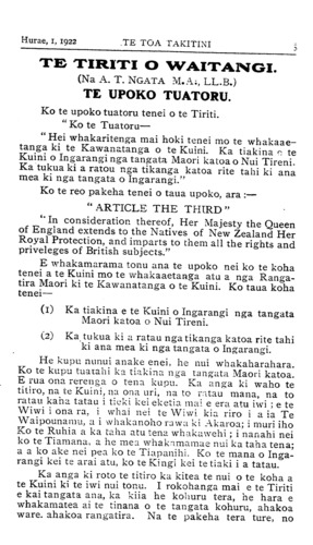 Hurae, 1, 1922TE TOA TAKITINI 5 TE TIRITI O WAITANGI. (Na A. T. NGATA M.A;, LL.B.) TE UPOKO TUATORU. Ko te upoko tuatoru tenei o te Tiriti. " Ko te Tuatoru— "Hei whakaritenga mai hoki tenei mo te whakaae- tanga ki te Kawanatanga o te Kuini. Ka tiakina o te Kuini o Ingarangi nga tangata Maori katoa o Nui Tireni. Ka tukua ki a ratou nga tikanga katoa rite tahi ki ana mea ki nga tangata o Ingarangi." Ko te reo pakeha tenei o taua upoko, ara :— " ARTICLE THE THIRD " "In consideration thereof, Her Majesty the Queen of England extends to the Natives of New Zealand Her Royal Protection, and imparts to them all the rights and priveleges of British subjects." E whakamarama tonu ana te upoko nei ko te koha tenei a te Kuini mo te whakaaetanga atu a nga Ranga- tira Maori ki te Kawanatanga o te Kuini. Ko taua koha tenei— (1) Ka tiakina e te Kuini o Ingarangi nga tangata Maori katoa o Nui Tireni. (2) Ka tukua ki a ratau nga tikanga katoa rite tahi ki ana mea ki nga tangata o Ingarangi. He kupu nunui anake enei, he nui whakaharahara. Ko te kupu tuatahi ka tiakina nga tangata Maori katoa. E rua ona rerenga o tena kupu. Ka anga ki waho te titiro, na te Kuini, na ona uri, na to ratau mana, na to ratau kaha tatau i tieki kei eketia mai e era atu iwi ; e te Wiwi i ona ra. i whai nei te Wiwi kia riro i a ia Te Waipounamu, a i whakanoho rawa ki Akaroa; i muri iho Ko te Ruhia a ka taha atu tena whakawehi ; i nanahi nei ko te Tiamana, a he mea whakamamae nui ka taha tena; a a ko ake nei pea ko te Tiapanihi. Ko te mana o Inga- rangi kei te arai atu, ko te Kingi kei te tiaki i a tatau. Ka anga ki roto te titiro ka kitea te nui o te koha a te Kuini ki te iwi nui tonu. I rokohanga mai e te Tiriti e kai tangata ana, ka kiia he kohuru tera, he hara e whakamatea ai te tinana o te tangata kohuru, ahakoa ware, ahakoa rangatira. Na te pakeha tera ture, no