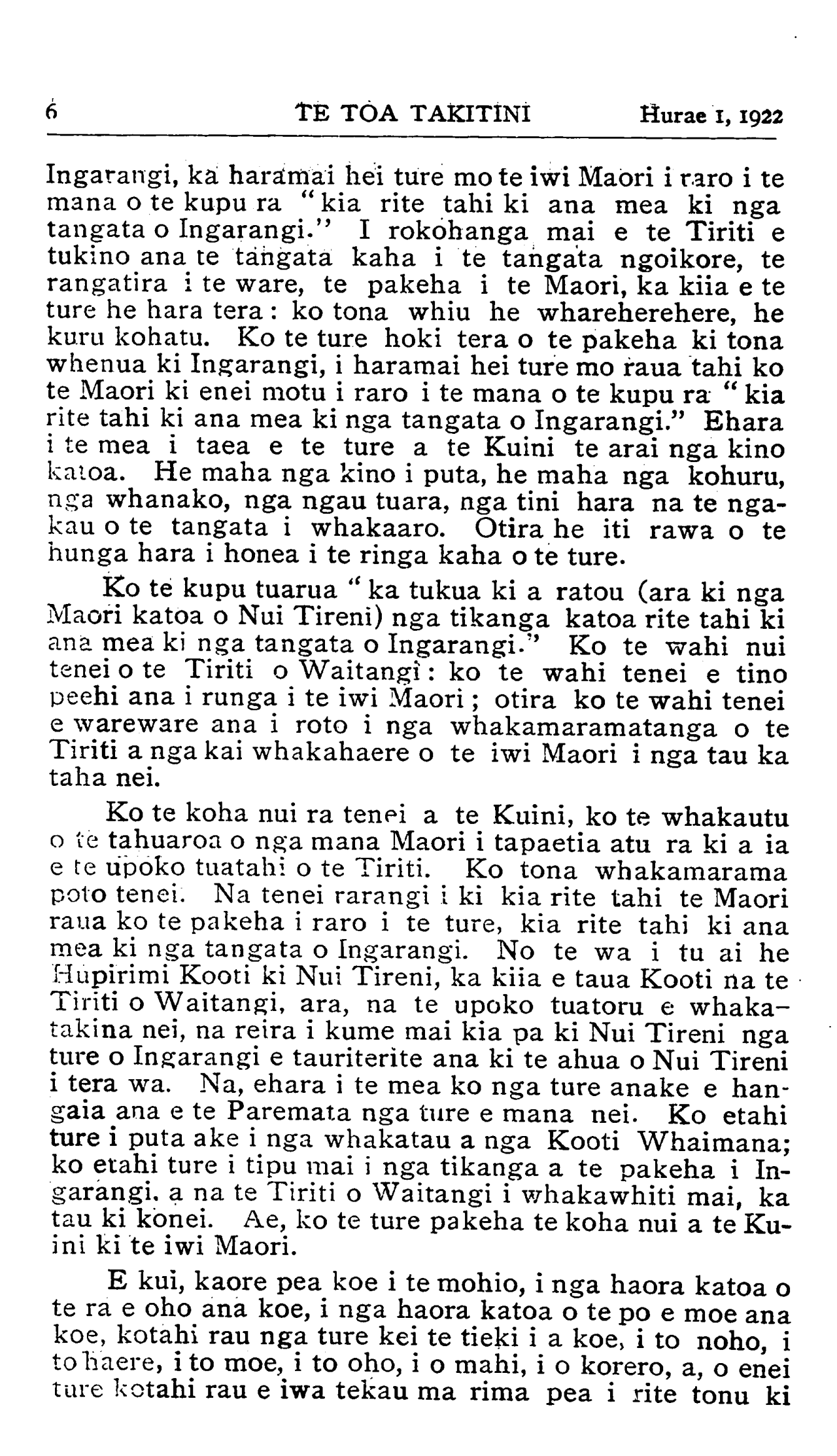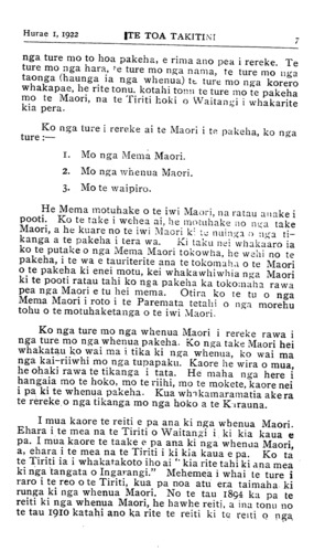 Hurae 1, 1922TE TOA TAKITINI 7 nga ture mo to hoa pakeha, e rima ano pea i rereke. Te ture mo nga hara, te ture mo nga nama, te ture mo nga taonga (haunga ia nga whenua) te ture mo nga korero whakapae, he rite tonu, kotahi tonu te ture mo te pakeha mo te Maori, na te Tiriti hoki o Waitangi i whakarite kia pera. Ko nga ture i rereke ai te Maori i te pakeha, ko nga ture:— 1.Mo nga Mema Maori. 2.Mo nga whenua Maori. 3.Mo te waipiro. He Mema motuhake o te iwi Maori, na ratau anake i pooti. Ko te rake i wehea ai, he motuhake no nga take Maori, a he kuare no te iwi Maori ki te nuinga o nga ti- kanga a te pakeha i tera wa. Ki taku nei whakaaro ia ko te putake o nga Mema Maori tokowha, he wehi no te pakeha, i te wa e tauriterite ana te tokomaha o te Maori o te pakeha ki enei motu, kei whakawhiwhia nga Maori ki te pooti ratau tahi ko nga pakeha ka tokomaha rawa pea nga Maori e tu hei mema. Otira ko te tu o nga Mema Maori i roto i te Paremata tetahi o nga morehu tohu o te motuhaketanga o te iwi Maori. Ko nga ture mo nga whenua Maori i rereke rawa i nga ture mo nga whenua pakeha. Ko nga take Maori hei whakatau ko wai ma i tika ki nga whenua, ko wai ma nga kai-riiwhi mo nga tupapaku. Kaore he wira o mua, he ohaki rawa te tikanga i tata. He maha nga here i hangaia mo te hoko, mo te riihi, mo te mokete, kaore nei i pa ki te whenua pakeha. Kua whakamaramatia ake ra te rereke o nga tikanga mo nga hoko a te Karauna. I mua kaore te reiti e pa ana ki nga whenua Maori. Ehara i te mea na te Tiriti o Waitangi i ki kia kaua e pa. I mua kaore te taake e pa ana ki nga whenua Maori, a, ehara i te mea na te Tiriti i ki kia kaua e pa. Ko ta te Tiriti ia i whakatakoto iho ai " kia rite tahi ki ana mea ki nga tangata o Ingarangi." Mehemea i whai te ture i raro i te reo o te Tiriti, kua pa noa atu era taimaha ki runga ki nga whenua Maori. No te tau 1894 ka pa te reiti ki nga whenua Maori, he hawhe reiti, a ina tonu no te tau 1910 katahi ano ka rite te reiti ki te reiti o nga