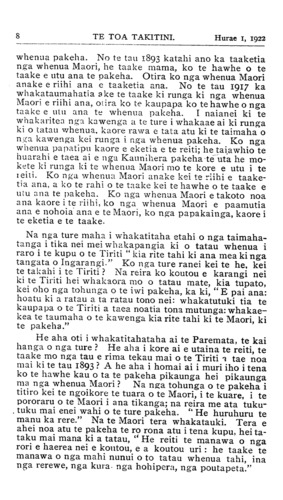 Hurae 1, 1922TE TOA TAKITINI. 9 Kaore e taea e tatau te kapo mai te Tiriti hei whaka- ngungu rakau ki te reiti, ki te taake. Na te ngawari o te Ture i ukauka ai. Ko te ture mo te waipiro kei te matatau tatau. Na te pakeha tera kai no tona whenua mai. Kotahi tonu to raua uunga mai ko te paipera, otira no mua tata atu te rama i te paipera. E kore pea e whakarereketia te ture mo te waipiro ki te Maori mehemea i ata kai te Maori i tera kai. Engari na te kai kino, na te waihotanga hei whakahinu mo nga hoko whenua, hei whakaporangi i nga rangatira kia moumou i o ratau rawa, hei kai whaka- pehapeha ki nga marae, ka titiro nga tohunga hanga ture, ka ki " E Ta ma, kaore e rawe ta tatau kai ki te iwi nei, he tauhou, he tamariki: me whakatu he rahui mo te kai nei, me rahui i etahi takiwa Maori, me rahui i te korokoro o te wahine Maori, me rahui kia kainga ki nga whare hoko waipiro, kaua e haria ki nga marae kai ai." Kei te haramai pea te ra e turakina ai nga rahui nei, kia utongatia te kaki Maori ki te kai nei, kia waia ona toto ki te kaka o te waipiro : tena ranei ka ki te pakeha, me whakakore rawa atu tenei kai i Nui Tireni. Kaati i konei aku whakamarama whanui mo tenei upoko o te Tiriti. Heoi taku he whakatupato ki te iwi e poipoi haere ana i te ingoa o te Tiriti, kia tupato i tenei wahi o te Tiriti kia tupato kei waiho hei huarahi mai mo etahi mate kei te ngaro atu, kei runga anake i te pakeha e taumaha ana, Mehemea he mate mo tatau ina hohoro te whakapakehatia o tatau, mehemea he taanga manawa mo tatau kei te ata tukutuku haere o nga tikanga pakeha, kaati waiho etahi wahi o te Tiriti kia ata moe ana. (Taria te roanga)