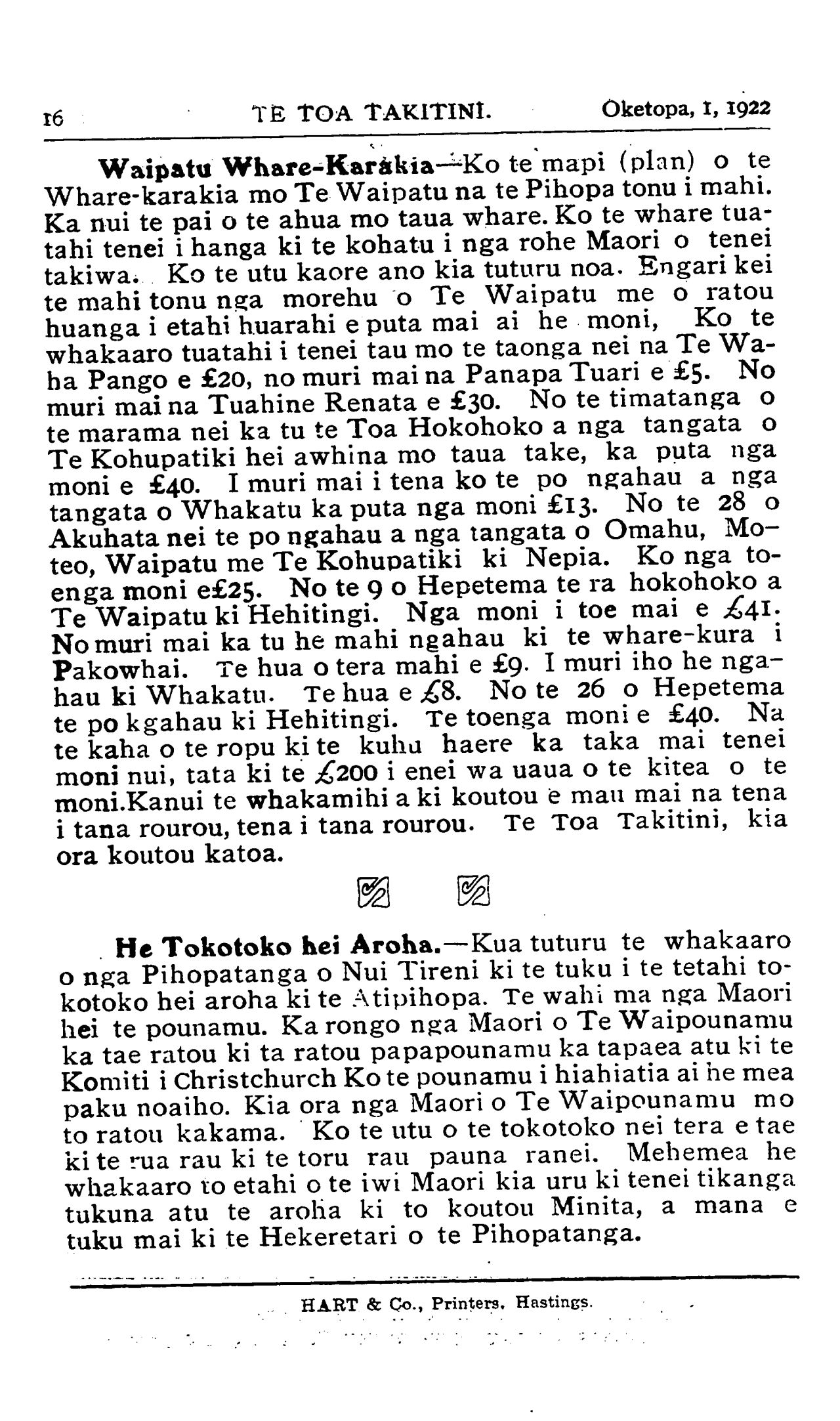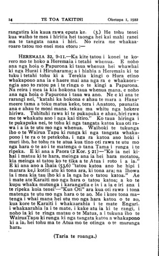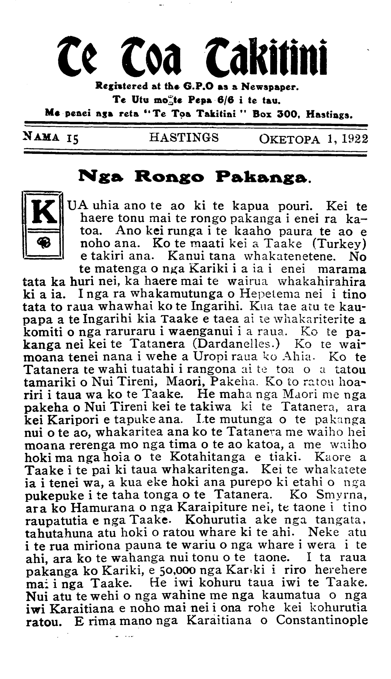 Te Toa Takitini Registered at the G.P.O as a Newspaper. Te Utu mo te Pepa 6/6 i te tau. Me penei nga reta "Te Toa Takitini " Box 300, Hastings. NAMA 15HASTINGS OKETOPA 1, 1922 Nga Rongo Pakanga. KUA uhia ano te ao ki te kapua pouri. Kei te haere tonu mai te rongo pakanga i enei ra ka- toa. Ano kei runga i te kaaho paura te ao e noho ana. Ko te maati kei a Taake (Turkey) e takiri ana. Kanui tana whakatenetene. No te matenga o nga Kariki i a ia i enei marama tata ka huri nei, ka haere mai te wairua whakahirahira ki a ia. I nga ra whakamutunga o Hepetema nei i tino tata to raua whawhai ko te Ingarihi. Kua tae atu te kau- papa a te Ingarihi kia Taake e taea ai te whakariterite a komiti o nga raruraru i waenganui i a raua. Ko te pa- kanga nei kei te Tatanera (Dardanelles.) Ko te wai- moana tenei nana i wehe a Uropi raua ko Ahia. Ko te Tatanera te wahi tuatahi i rangona ai te toa o a tatou tamariki o Nui Tireni, Maori, Pakeha. Ko to ratou hoa- riri i taua wa ko te Taake. He maha nga Maori me nga pakeha o Nui Tireni kei te takiwa ki te Tatanera, ara kei Karipori e tapuke ana. te mutunga o te pakanga nui o te ao, whakaritea ana ko te Tatanera me waiho hei moana rerenga mo nga tima o te ao katoa, a me waiho hoki ma nga hoia o te Kotahitanga e tiaki. Kaore a Taake i te pai ki taua whakaritenga. Kei te whakatete ia i tenei wa, a kua eke hoki ana purepo ki etahi o nga pukepuke i te taha tonga o te Tatanera. Ko Smyrna, ara ko Hamurana o nga Karaipiture nei, te taone i tino raupatutia e nga Taake. Kohurutia ake nga tangata, tahutahuna atu hoki o ratou whare ki te ahi. Neke atu i te rua miriona pauna te wariu o nga whare i wera i te ahi, ara ko te wahanga nui tonu o te taone. I ta raua pakanga ko Kariki, e 50,000 nga Kariki i riro herehere mai i nga Taake. He iwi kohuru taua iwi te Taake. Nui atu te wehi o nga wahine me nga kaumatua o nga iwi Karaitiana e noho mai nei i ona rohe kei kohurutia ratou. E rima mano nga Karaitiana o Constantinople