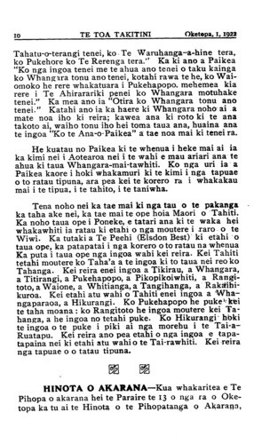 10\_\_\_\_\_\_\_\_\_\_TE TOA TAKITINI\_\_\_\_\_\_Oketopa, 1, 1922 Tahatu-o-terangi tenei, ko Te Waruhanga-a-hine tera, ko Pukehore ko Te Rerenga tera." Ka ki ano a Paikea "Ko nga ingoa tenei me te ahua ano tenei o taku kainga ko Whangara tonu ano tenei, kotahi rawa te he, ko Wai- omoko he rere whakatuara i Pukehapopo. mehemea kia rere i Te Ahirarariki penei ko Whangara motuhake tenei." Ka mea ano ia "Otira ko Whangara tonu ano tenei." Katahi ano ia ka haere ki Whangara noho ai a mate noa iho ki reira; kawea ana ki roto ki te ana takoto ai, waiho tonu iho hei toma taua ana, huaina ana te ingoa "Ko te Ana-o-Paikea" a tae noa mai ki tenei ra. He kuatau no Paikea ki te whenua i heke mai ai ia ka kimi nei i Aotearoa nei i te wahi e mau ariari ana te ahua ki taua Whangara-mai-tawhiti. Ko nga uri ia a Paikea kaore i hoki whakamuri ki te kimi i nga tapuae o to ratau tipuna, ara pea kei te korero ra i whakakau mai i te tipua, i te tahito, i te taniwha. Tena noho nei ka tae mai ki nga tau o te pakanga ka taha ake nei, ka tae mai te ope hoia Maori o Tahiti. Ka noho taua ope i Poneke, e tatari ana ki te waka hei whakawhiti ia ratau ki etahi o nga moutere i raro o te Wiwi. Ka tutaki a Te Peehi (Elsdon Best) ki etahi o taua ope, ka patapatai i nga korero o to ratau na whenua Ka puta i taua ope nga ingoa wahi kei reira. Kei Tahiti tetahi moutere ko Taha'a a te ingoa ki to taua nei reo ko Tahanga. Kei reira enei ingoa a Tikirau, a Whangara, a Titirangi, a Pukehapopo, a Pikopikoiwhiti, a Rangi- toto, a Waione, a Whitianga, a Tangihanga, a Rakaihi- kuroa. Kei etahi atu wahi o Tahiti enei ingoa a Wha- ngaparaoa, a Hikurangi. Ko Pukehapopo he puke kei te taha moana : ko Rangitoto he ingoa moutere kei Ta- hanga, a he ingoa no tetahi puke. Ko Hikurangi hoki te ingoa o te puke i piki ai nga morehu i te Tai-a- Ruatapu. Kei reira ano pea etahi o nga ingoa e tapa- tapaina nei ki etahi atu wahi o te Tai-rawhiti. Kei reira nga tapuae o o tatau tipuna. HINOTA O AKARANA—Kua whakaritea e Te Pihopa o akarana hei te Paraire te 13 o nga ra o Oke- topa ka tu ai te Hinota o te Pihopatanga o Akarana,