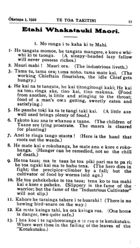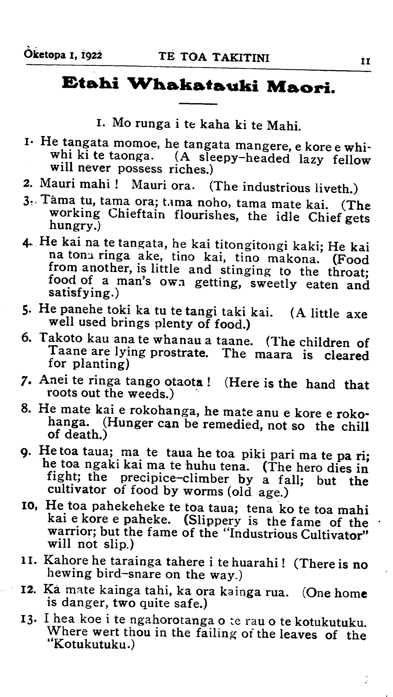 Oketopa 1, 1922\_\_\_\_\_\_TE TOA TAKITINI11 Etahi Whakatauki Maori. I. Mo runga i te kaha ki te Mahi. 1. He tangata momoe, he tangata mangere, e kore e whi- whi ki te taonga. (A sleepy-headed lazy fellow will never possess riches.) 2. Mauri mahi ! Mauri ora. (The industrious liveth.) 3. Tama tu, tama ora; tama noho, tama mate kai. (The working Chieftain flourishes, the idle Chief gets hungry.) 4. He kai na te tangata, he kai titongitongi kaki; He kai na tona ringa ake, tino kai, tino makona. (Food from another, is little and stinging to the throat; food of a man's own getting, sweetly eaten and satisfying.) 5. He panehe toki ka tu te tangi taki kai. (A little axe well used brings plenty of food.) 6. Takoto kau ana te whanau a taane. (The children of Taane are lying prostrate. The maara is cleared for planting) 7. Anei te ringa tango otaota ! (Here is the hand that roots out the weeds.) 8. He mate kai e rokohanga, he mate anu e kore e roko- hanga. (Hunger can be remedied, not so the chill of death.) 9. He toa taua; ma te taua he toa piki pari ma te pa ri; he toa ngaki kai ma te huhu tena. (The hero dies in fight; the precipice-climber by a fall; but the cultivator of food by worms (old age.) 10. He toa pahekeheke te toa taua; tena ko te toa mahi kai e kore e paheke. (Slippery is the fame of the warrior; but the fame of the "Industrious Cultivator" will not slip.) 11. Kahore he tarainga tahere i te huarahi! (There is no hewing bird-snare on the way.) 12. Ka mate kainga tahi, ka ora kainga rua. (One home is danger, two quite safe.) 13. I hea koe i te ngahorotanga o te rau o te kotukutuku. Where wert thou in the failing of the leaves of the "Kotukutuku.)