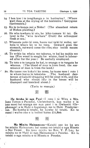 12TE TOA TAKITINI Oketopa 1, 1922 14. I hea koe i te tangihanga o te horirerire ? (Where wert thou at the crying of the horirerire ? Gerygone flaviventris.) 15. Ko te to-kanga nui a Noho! (The abundant return of Nohos planting.) 16. He wha tawhara ki uta, he kiko tamure ki tai. (In land is the "wha tawhara" (fruit) the schnapper flesh at sea.) 17. Whanatu poho ki roto, haere mai taiki ki waho; no- hoia te whare ko te he tonu. (Inward goes the stomach, outward come the ribs; stay inside means disaster.) 18. Te wahie ka whaia mo takurua, te kai ka mahia mo tau (Fire wood is sought for winter, food is labour- ed after for the year.) Be usefully employed. 19. Te toto o te tangata he kai, te oranga o te tangata he whenua. (The blood of man is from food, the sus- tenance of man is from the land.) 20. He taane rou kakahi ka moea, he taane moe i roto i te whare kurua te takataka. (The husband dex- terous at kakahi-dragging will be slept with, and the husband who sleeps idly in the house will be thumped and knocked about.) (Taria te roanga.) He Aroha ki nga Pani—I roto i te Wira a Mrs. Jane Tutton o Papanui, Christchurch, kua waiho e ia ana moni hei oranga mo nga pani i te Owheniti (Or- phanage) a te Hahi o Ingarangi, me te Hahi Presbyter- ian. He hawhe ki tetahi, he hawhe ki tetahi. Ko te moni i waiho ake e ia huihui katoa £11,8oo. He Minita Hainamana—Katahi ano ko ka uru he minita Hainamana hei mema mo tetahi o nga Hinota o Nui Tireni. Ko tana minita ko Rev. Y. P. Lee, he minita no te Hahi ki nga Hainamana o Poneke. Ko ia tetahi o nga minita o te Hinota o Poneke.