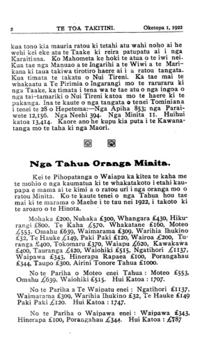 2\_\_\_\_\_\_\_\_\_\_TE TOA TAKITINI.\_\_\_\_\_\_Oketopa 1, 1922 kua tono kia mauria ratou ki tetahi atu wahi noho ai he wehi kei eke atu te Taake ki reira patupatu ai i nga Karaitiana. Ko Mahometa ke hoki te atua o te iwi nei. Kua tae nga Manuao a te Ingarihi a te Wiwi a te Mari- kana ki taua takiwa tirotiro haere ai i a ratou tangata. Kua timata te takatu o Nui Tireni. Ka tae mai te whakaatu a Te Pirimia o Ingarangi mo te raruraru ki nga Taake, ka timata i tena wa te tae atu o nga ingoa o nga tai-tamariki o Nui Tireni katoa mo te haere ki te pakanga. Ina te kaute o nga tangata o tenei Tominiana i tenei te 28 o Hepetema:—Nga Apiha 853; nga Parai- wete 12,156. Nga Neehi 394. Nga Minita II. Huihui katoa 13,414- Kaore ano he kupu kia puta i te Kawana- tanga mo te taha ki nga Maori. Nga Tahua Oranga Minita. Kei te Pihopatanga o Waiapu ka kitea te kaha me te mohio o nga kaumatua ki te whakatakoto i etahi kau- papa e mama ai te kimi a o ratou uri i nga oranga mo o ratou Minita. Ko te kaute tenei o nga Tahua hou tae mai ki te marama o Maehe i te tau nei 1922, i takoto ki te aroaro o te Hinota. Mohaka £200, Nuhaka £300, Whangara £430, Hiku- rangi £800, Te Kaha £570, Whakatane £160, Moteo £553, Omahu £639, Waimarama £309, Warihia Ihukino £32, Te Hauke £149, Paki Paki £120, Wairoa £200, Tu- ranga £400, Tokomaru £370, Waiapu £620, Kawakawa £400, Tauranga £420, Waiohiki £515, Ngatihori £1137, Waipawa £343, Hinerapa Rapaea £100, Porangahau £344, Taupo £300, Airini Tonore Tahua £1000. No te Pariha o Moteo enei Tahua : Moteo £553, Omahu £639, Waiohiki £515. Hui Katoa : 1707. No te Pariha a Te Waipatu enei : Ngatihori £1137, Waimarama £309, Warihia Ihukino £32, Te Hauke £149 Paki Paki £120. Hui Katoa : 1747. No te Pariha o Waipawa enei : Waipawa £343, Hinerapa £100, Porangahau £344. Hui Katoa :