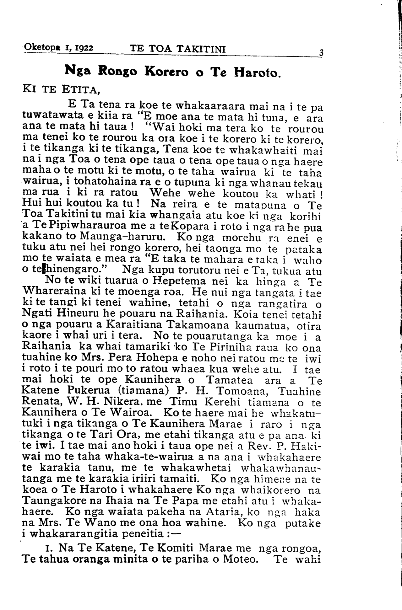 Oketopa 1, 1922\_\_\_\_\_\_TE TOA TAKITINI\_\_\_\_\_\_\_\_\_\_\_\_3 Nga Rongo Korero o Te Haroto. KI TE ETITA, E Ta tena ra koe te whakaaraara mai na i te pa tuwatawata e kiia ra "E moe ana te mata hi tuna, e ara ana te mata hi taua ! "Wai hoki ma tera ko te rourou ma tenei ko te rourou ka ora koe i te korero ki te korero, i te tikanga ki te tikanga, Tena koe te whakawhaiti mai na i nga Toa o tena ope taua o tena ope taua o nga haere maha o te motu ki te motu, o te taha wairua ki te taha wairua, i tohatohaina ra e o tupuna ki nga whanau tekau ma rua i ki ra ratou Wehe wehe koutou ka whati ! Hui hui koutou ka tu ! Na reira e te matapuna o Te Toa Takitini tu mai kia whangaia atu koe ki nga korihi a Te Pipiwharauroa me a te Kopara i roto i nga ra he pua kakano to Maunga-haruru. Ko nga morehu ra enei e tuku atu nei hei rongo korero, hei taonga mo te pataka mo te waiata e mea ra "E taka te mahara e taka i waho o te hinengaro." Nga kupu torutoru nei e Ta, tukua atu No te wiki tuarua o Hepetema nei ka hinga a Te Whareraina ki te moenga roa. He nui nga tangata i tae ki te tangi ki tenei wahine, tetahi o nga rangatira o Ngati Hineuru he pouaru na Raihania. Koia tenei tetahi o nga pouaru a Karaitiana Takamoana kaumatua, otira kaore i whai uri i tera. No te pouarutanga ka moe i a Raihania ka whai tamariki ko Te Piriniha raua ko ona tuahine ko Mrs. Pera Hohepa e noho nei ratou me te iwi i roto i te pouri mo to ratou whaea kua wehe atu. I tae mai hoki te ope Kaunihera o Tamatea ara a Te Katene Pukerua (tiamana) P. H. Tomoana, Tuahine Renata, W. H. Nikera, me Timu Kerehi tiamana o te Kaunihera o Te Wairoa. Ko te haere mai he whakatu- tuki i nga tikanga o Te Kaunihera Marae i raro i nga tikanga o te Tari Ora, me etahi tikanga atu e pa ana ki te iwi. I tae mai ano hoki i taua ope nei a Rev. P. Haki- wai mo te taha whaka-te-wairua a na ana i whakahaere te karakia tanu, me te whakawhetai whakawhanau- tanga me te karakia iriiri tamaiti. Ko nga himene na te koea o Te Haroto i whakahaere Ko nga whaikorero na Taungakore na Ihaia na Te Papa me etahi atu i whaka- haere. Ko nga waiata pakeha na Ataria, ko nga haka na Mrs. Te Wano me ona hoa wahine. Ko nga putake i whakararangitia peneitia :— I. Na Te Katene, Te Komiti Marae me nga rongoa, Te tahua oranga minita o te pariha o Moteo. Te wahi