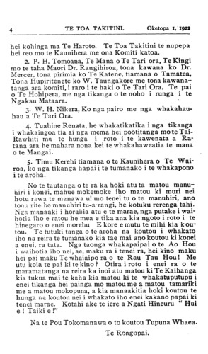 4TE TOA TAKITINI. Oketopa 1, 1922 hei kohinga ma Te Haroto. Te Toa Takitini te nupepa hei reo mo te Kaunihera me ona Komiti katoa. 2. P. H. Tomoana, Te Mana o Te Tari ora, Te Kingi mo te taha Maori Dr. Rangihiroa, tona kawana ko Dr. Mercer, tona pirimia ko Te Katene, tiamana o Tamatea, Tona Hupiritenete ko W. Taungakore me tona kawana- tanga ara komiti, i raro i te haki o Te Tari Ora, Te pai o Te Hohipera, me nga tikanga o te noho i runga i te Ngakau Mataara. 3. W. H. Nikera, Ko nga pairo me nga whakahau- hau a Te Tari Ora. 4. Tuahine Renata, he whakatikatika i nga tikanga i whakaingoa tia ai nga mema hei pootitanga mo te Tai- Rawhiti ma te hunga i roto i te kawenata a Ra- tana ara he mahara nona kei te whakahaweatia te mana o te Mangai. 5. Timu Kerehi tiamana o te Kaunihera o Te Wai- roa, ko nga tikanga hapai i te tumanako i te whakapono i te aroha. No te tautanga o te ra ka hoki atu ta matou manu- hiri i konei, mahue mokemoke iho matou ki muri nei hotu rawa te manawa u! mo tenei tu o te manuhiri, ano tona rite he manuhiri tu-a-rangi, he kotuku rerenga tahi. Nga manaaki i horahia atu e te marae, nga putake i wai- hotia iho e ratou he mea e tika ana kia ngoto i roto i te hinegaro o enei morehu E kore e mutu te mihi kia kou- tou. Te tutuki tanga o te aroha na koutou i whakato iho na reira te tumanako kia tae mai ano koutou ki konei a enei, ra tata. Nga taonga whakapaipai o te Ao Hou i waihotia iho nei, ae, maku ra i tenei ra, hei kino maku hei pai maku Te whaiaipo ra o te Rau Tau Hou! Me utu koia te pai ki te kino ? Otira i roto i enei ra o te maramatanga na reira ka inoi atu matou ki Te Kaihanga kia tukua mai te kaha kia matou ki te whakatuputupu i enei tikanga hei painga mo matou me a matou tamariki me a matou mokopuna, a kia manaakitia hoki koutou te hunga na koutou nei i whakato iho enei kakano papai ki tenei marae. Kotahi ake te iere a Ngati Hineuru " Hui e ! Taiki e !" Na te Pou Tokomanawa o to koutou Tupuna Whaea. Te Rongopai.