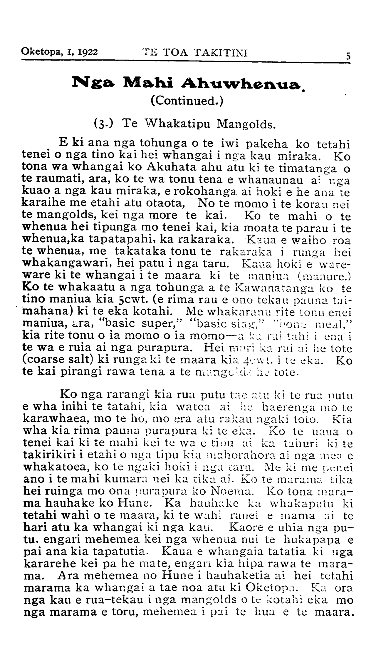 Oketopa, 1, 1922TE TOA TAKITINI Nga Mahi Ahuwhenua. (Continued.) (3.) Te Whakatipu Mangolds. E ki ana nga tohunga o te iwi pakeha ko tetahi tenei o nga tino kai hei whangai i nga kau miraka. Ko tona wa whangai ko Akuhata ahu atu ki te timatanga o te raumati, ara, ko te wa tonu tena e whanaunau ai nga kuao a nga kau miraka, e rokohanga ai hoki e he ana te karaihe me etahi atu otaota, No te momo i te korau nei te mangolds, kei nga more te kai. Ko te mahi o te whenua hei tipunga mo tenei kai, kia moata te parau i te whenua.ka tapatapahi, ka rakaraka. Kana e waiho roa te whenua, me takataka tonu te rakaraka i runga hei whakangawari, hei patu i nga taru. Kaua hoki e ware- ware ki te whangai i te maara ki te maniua (manure.) Ko te whakaatu a nga tohunga a te Kawanatanga ko te tino maniua kia 5cwt. (e rima rau e ono tekau pauna tai- mahana) ki te eka kotahi. Me whakaranu rite tonu enei maniua, .ara, "basic super," "basic slag," "bone meal,'' kia rite tonu o ia momo o ia momo—a ka rui tahi i ena i te wa e ruia ai nga purapura. Hei muri ka rui ai he tote (coarse salt) ki runga ki te maara kia 4cwt. i te eka. Ko te kai pirangi rawa tena a te mangolds he tote. Ko nga rarangi kia rua putu tae atu ki te rua putu e wha inihi te tatahi, kia watea ai he haerenga mo te karawhaea, mo te ho, mo era atu rakau ngaki toto. Kia wha kia rima pauna purapura ki te eka. Ko te uaua o tenei kai ki te mahi kei te wa e tiuu ai ka tahuri ki te takirikiri i etahi o nga tipu kia mahorahora ai nga mea e whakatoea, ko te ngaki hoki i nga taru. Me ki me penei ano i te mahi kumara nei ka tika ai. Ko te marama tika hei ruinga mo ona purapura ko Noema. Ko tona mara- ma hauhake ko Hune. Ka hauhake ka whakaputu ki tetahi wahi o te maara, ki te wahi ranei e mama ai te hari atu ka whangai ki nga kau. Kaore e uhia nga pu- tu, engari mehemea kei nga whenua nui te hukapapa e pai ana kia tapatutia. Kaua e whangaia tatatia ki nga kararehe kei pa he mate, engari kia hipa rawa te mara- ma. Ara mehemea no Hune i hauhaketia ai hei tetahi marama ka whangai a tae noa atu ki Oketopa. Ka ora nga kau e rua-tekau i nga mangolds o te kotahi eka mo nga marama e toru, mehemea i pai te hua e te maara.