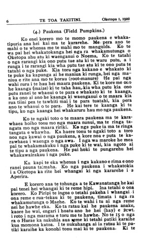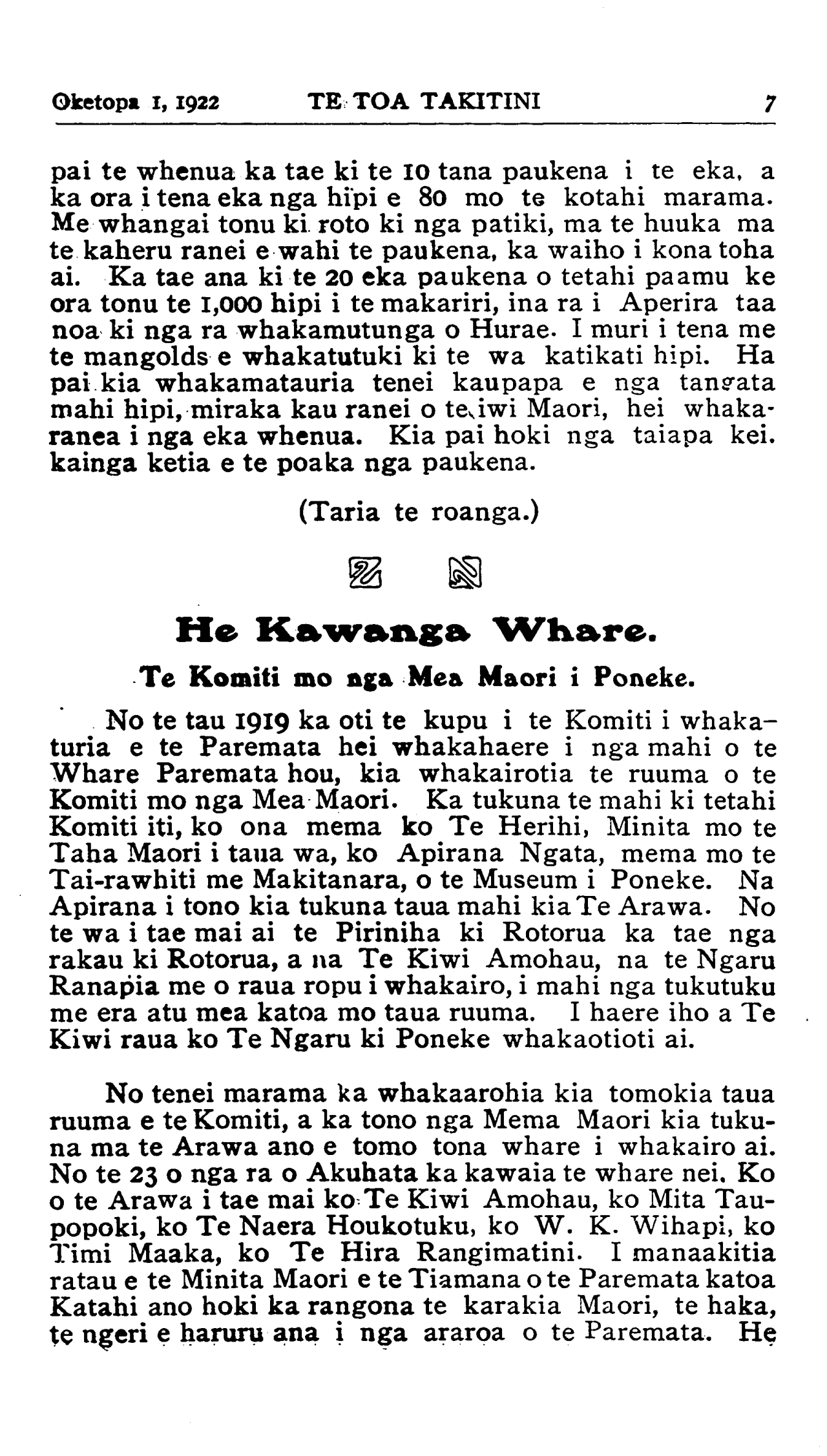 Oketopa 1, 1922TE TOA TAKITINI 7 pai te whenua ka tae ki te IO tana paukena i te eka, a ka ora i tena eka nga hipi e 80 mo te kotahi marama. Me whangai tonu ki roto ki nga patiki, ma te huuka ma te kaheru ranei e wahi te paukena, ka waiho i kona toha ai. Ka tae ana ki te 20 eka paukena o tetahi paamu ke ora tonu te 1,000 hipi i te makariri, ina ra i Aperira taa noa ki nga ra whakamutunga o Hurae. I muri i tena me te mangolds e whakatutuki ki te wa katikati hipi. Ha pai kia whakamatauria tenei kaupapa e nga tangata mahi hipi, miraka kau ranei o te iwi Maori, hei whaka- ranea i nga eka whenua. Kia pai hoki nga taiapa kei. kainga ketia e te poaka nga paukena. (Taria te roanga.) He Kawanga Whare. Te Komiti mo nga Mea Maori i Poneke. No te tau 1919 ka oti te kupu i te Komiti i whaka- turia e te Paremata hei whakahaere i nga mahi o te Whare Paremata hou, kia whakairotia te ruuma o te Komiti mo nga Mea Maori. Ka tukuna te mahi ki tetahi Komiti iti, ko ona mema ko Te Herihi, Minita mo te Taha Maori i taua wa, ko Apirana Ngata, mema mo te Tai-rawhiti me Makitanara, o te Museum i Poneke. Na Apirana i tono kia tukuna taua mahi kia Te Arawa. No te wa i tae mai ai te Piriniha ki Rotorua ka tae nga rakau ki Rotorua, a na Te Kiwi Amohau, na te Ngaru Ranapia me o raua ropu i whakairo, i mahi nga tukutuku me era atu mea katoa mo taua ruuma. I haere iho a Te Kiwi raua ko Te Ngaru ki Poneke whakaotioti ai. No tenei marama ka whakaarohia kia tomokia taua ruuma e te Komiti, a ka tono nga Mema Maori kia tuku- na ma te Arawa ano e tomo tona whare i whakairo ai. No te 23 o nga ra o Akuhata ka kawaia te whare nei. Ko o te Arawa i tae mai ko Te Kiwi Amohau, ko Mita Tau- popoki, ko Te Naera Houkotuku, ko W. K. Wihapi, ko Timi Maaka, ko Te Hira Rangimatini. I manaakitia ratau e te Minita Maori e te Tiamana o te Paremata katoa Katahi ano hoki ka rangona te karakia Maori, te haka, te ngeri e haruru ana i nga araroa o te Paremata. He