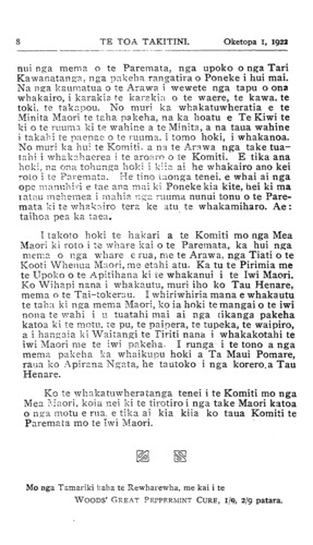 TE TOA TAKITINI.Oketopa I, 1922 nui nga mema o te Paremata, nga upoko o nga Tari Kawanatanga, nga pakeha rangatira o Poneke i hui mai. Na nga kaumatua o te Arawa i wewete nga tapu o ona whakairo, i karakia te karakia o te waere, te kawa, te toki, te takapou. No muri ka whakatuwheratia e te Minita Maori te taha pakeha, na ka hoatu e Te Kiwi te ki o te ruuma ki te wahine a te Minita, a na taua wahine i takahi te paepae o te mama, i tomo hoki, i whakanoa. No muri ka hu: te Komiti, a na te Arawa nga take tua- tahi i whakahaerea i te aroaro o te Komiti. E tika ana hoki, na ona tohunga hoki i kiia ai he whakairo ano kei roto i te Paremata. Me tino taonga tenei, e whai ai nga ope manuhiri e tae ana mai ki Poneke kia kite, hei ki ma ratau mehemea i mahia nga ruuma nunui tonu o te Pare- mata ki te whakairo tera ke atu te whakamiharo. Ae: taihoa pea ka taea. I takoto hoki te hakari a te Komiti mo nga Mea Maori ki roto i te whare kai o te Paremata, ka hui nga mema o nga whare e rua, me te Arawa, nga Tiati o te Kooti Whenua Maori, me etahi atu. Ka tu te Pirimia me te Upoko o te Apitihana ki te whakanui i te Iwi Maori. Ko Wihapi nana i whakautu, muri iho ko Tau Henare, mema o te Tai-tokerau. I whiriwhiria mana e whakautu te taha ki nga mema Maori, ko ia hoki te mangai o te iwi nona te wahi i u tuatahi mai ai nga tikanga pakeha katoa ki te motu, te pu, te paipera, te tupeka, te waipiro, a i hangaia ki Waitangi te Tiriti nana i whakakotahi te iwi Maori rae te iwi pakeha. I runga i te tono a nga mema pakeha ka whaikupu hoki a Ta Maui Pomare, raua ko Apirana Ngata, he tautoko i nga korero a Tau Henare. Ko te whakatuwheratanga tenei i te Komiti mo nga Mea Maori, koia nei ki te tirotiro i nga take Maori katoa o nga motu e rua, e tika ai kia kiia ko taua Komiti te Paremata mo te Iwi Maori. Mo nga Tamariki kaha te Rewharewha, me kai i te WOODS' GREAT PEPPERMINT CURE, 1/9, 2/9 patara.
