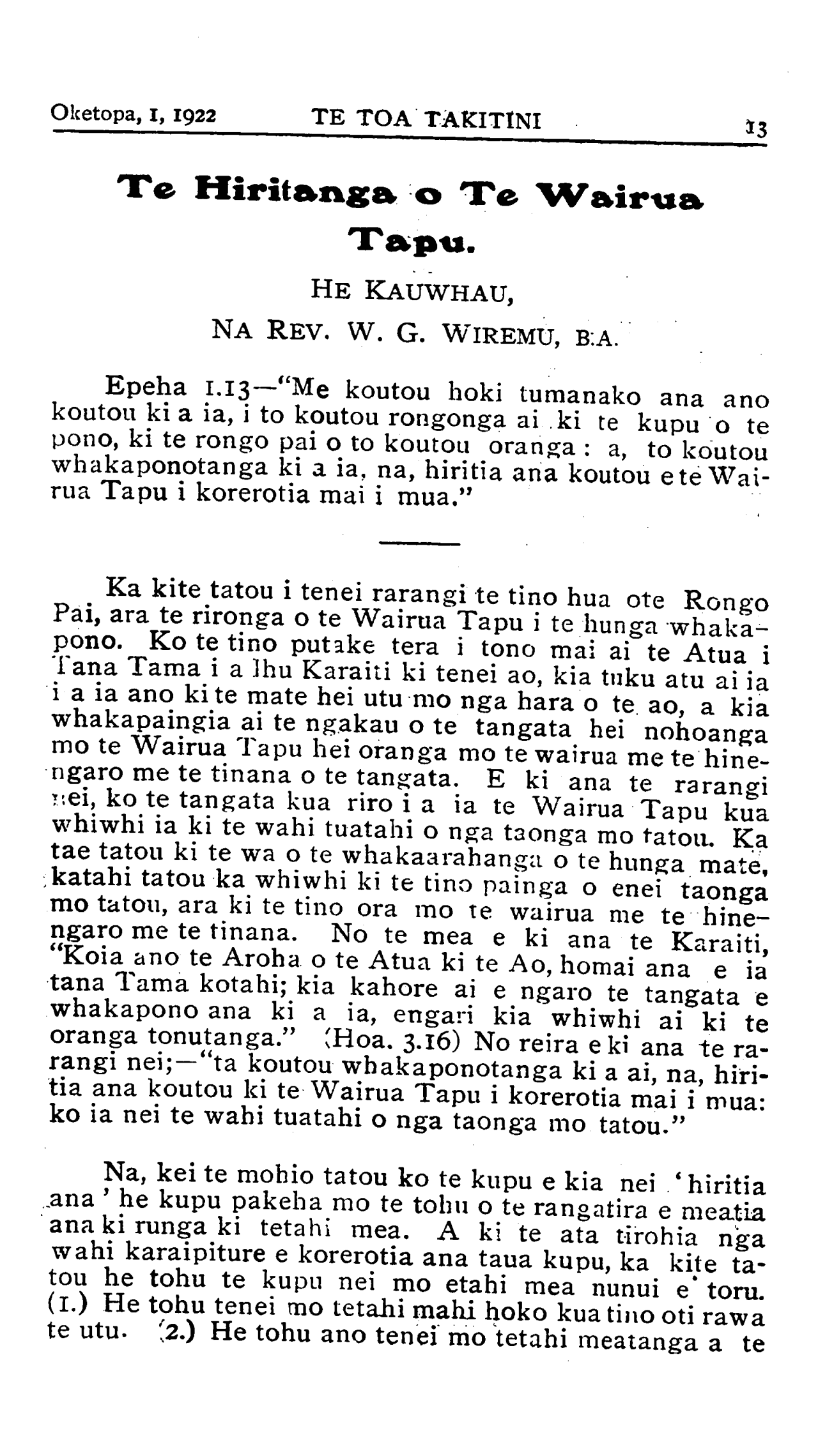 Oketopa, 1, 1922TE TOA TAKITINI 13 TE HIRITANGA O TE WAIRUA Tapu. HE KAUWHAU, NA REV. W. G. WIREMU, B.A. Epeha 1.13 — "Me koutou hoki tumanako ana ano koutou ki a ia, i to koutou rongonga ai ki te kupu o te pono, ki te rongo pai o to koutou oranga : a, to koutou whakaponotanga ki a ia, na, hiritia ana koutou e te Wai- rua Tapu i korerotia mai i mua." Ka kite tatou i tenei rarangi te tino hua o te Rongo Pai, ara te rironga o te Wairua Tapu i te hunga whaka- pono. Ko te tino putake tera i tono mai ai te Atua i Tana Tama i a Ihu Karaiti ki tenei ao, kia tuku atu ai ia i a ia ano ki te mate hei utu mo nga hara o te ao, a kia whakapaingia ai te ngakau o te tangata hei nohoanga mo te Wairua Tapu hei oranga mo te wairua me te hine- ngaro me te tinana o te tangata. E ki ana te rarangi nei, ko te tangata kua riro i a ia te Wairua Tapu kua whiwhi ia ki te wahi tuatahi o nga taonga mo tatou. Ka tae tatou ki te wa o te whakaarahanga o te hunga mate, katahi tatou ka whiwhi ki te tino painga o enei taonga mo tatou, ara ki te tino ora mo te wairua me te hine- ngaro me te tinana. No te mea e ki ana te Karaiti, "Koia ano te Aroha o te Atua ki te Ao, homai ana e ia tana Tama kotahi; kia kahore ai e ngaro te tangata e whakapono ana ki a ia, engari kia whiwhi ai ki te oranga tonutanga." (Hoa. 3.16) No reira e ki ana te ra- rangi nei;—"ta koutou whakaponotanga ki a ai, na, hiri- tia ana koutou ki te Wairua Tapu i korerotia mai i mua: ko ia nei te wahi tuatahi o nga taonga mo tatou." Na, kei te mohio tatou ko te kupu e kia nei ' hiritia ana ' he kupu pakeha mo te tohu o te rangatira e meatia ana ki runga ki tetahi mea. A ki te ata tirohia nga wahi karaipiture e korerotia ana taua kupu, ka kite ta- tou he tohu te kupu nei mo etahi mea nunui e* toru. (1) He tohu tenei mo tetahi mahi hoko kua tino oti rawa te utu. (2.) He tohu ano tenei mo tetahi meatanga a te