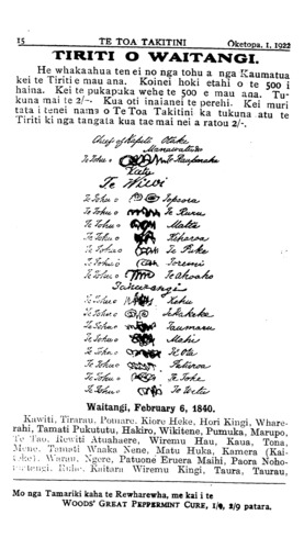 15\_\_\_\_\_\_\_\_\_\_\_TE TOA TAKITINI\_\_\_\_\_\_Oketopa. I. TIRITI O WAITANGI. He whakaahua tenei no nga tohu a nga Kaumatua kei te Tiriti e mau ana. Koinei hoki etahi o te 500 i haina. Kei te pukapuka wehe te 500 e mau ana. Tu- kuna mai te 2/-- Kua oti inaianei te perehi. Kei muri tata i tenei nama o Te Toa Takitini ka tukuna atu te Tiriti ki nga tangata kua taemai net a ratou 2/-. Waitangi, February 6, 1840. Kawiti, Tirarau, Pomare Kiore Heke, Hori Kingi, Whare- rahi, Tamati Pukututu, Hakiro, Wikitene, Pumuka, Marupo, Te Tau. Rewiti Atuahaere, Wiremu Hau, Kaua, Tona, -Mene. Tamati Waaka Nene, Matu Huka, Kamera (Kai- eke). Warau, Ngere, Patuone Eruera Maihi, Paora Noho- •r:;'t.?'ii.'.u. .Iit;hr. Kaitara Wiremu Kingi, Taura. Taurau, Mo nga Tamariki kaha te Rewharewha, me kai i te WOODS' GREAT PEPPERMINT CURE, 1/9, 1/9 patara.