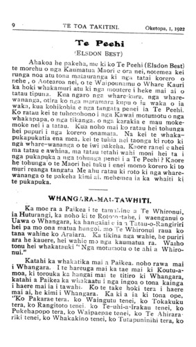 9TE TOA TAKITINI. Oketopa, 1, 1922 Te Peehi (ELSDON BEST) Ahakoa he pakeha, me ki ko Te Peehi (Elsdon Best) te morehu o nga Kaumatua Maori e ora nei, notemea kei runga noa atu tona matauranga ki nga tatai korero o nehe , o Aotearoa nei, o te Waipounamu o Whare Kauri ka hoki whakamuri atu ki nga moutere i heke mai ai o tatau tipuna. Kua ngaro nga whare-kura, nga whare- wananga, otira ko nga maramara kupu o ia waka o ia waka, kua kohikohia e nga tangata penei ia Te Peehi. Ko ratau kei te tuhonohono i nga Kawai motumotu o nga whakapapa, o nga tikanga, o nga karakia e mau moke- moke nei i a tatau. Kua noho mai ko ratau hei tohunga hei pupuri i nga korero onamata. Na kei te whaka- pukapukatia ena mea, kei te tuhia nei taonga ki roto ki nga whare-wananga o te iwi pakeha. Kaore ranei e ahei ma tatau e awhina, ma tatau retain wahi moni hei ta i nga pukapuka a nga tohunga penei i a Te Peehi ? Kaore he tohunga o te Maori hei tuku i enei momo korero ki to muri reanga tangata Me ahu ratau ki roto ki nga whare- wananga o te pakeha kimi ai, mehemea ia ka whaiti ki te pukapuka. WHANGARA-MAI-TAWHITI. Ka moe ra a Paikea i te tamahine a Te Whironui, ia Huturangi, ka noho ki te Roto-o-tahe, i waenganui o Uawa o Whangara, ka hangaiai e ia a Tatau-o-Rangiriri hei pa mo ona matua hungoi, mo Te Whironui raua ko tana wahine ko Araiara. Ka tikina nga wahie, he puriri ara he kauere, hei wahie mo nga kaumatua ra. Waiho tonu hei whakatauki " Nga motumotu o te ahi a Whiro- nui." Katahi ka whakatika mai .1 Paikea, noho rawa mai i Whangara. I te harenga mai ka tae mai ki Koutu-a- moa, ki torouka ka hangai mai te titiro ki Whangara, katahi a Paikea ka whakaatu i nga ingoa o tona kainga i haere mai ia i tawahi. Ko te take hoki tera i haere mai ai, he kimi i Whangara. Ka ki a ia ki tona ope, "Ko Pakarae tera, ko Waingutu tenei, ko Tokakuku tera, ko Rangitoto tenei ko Te-uhi-a-Irakau tenei, ko Pukehapopo tera, ko Waipaepae tenei, ko Te Ahirara- riki tenei, ko Whakakino tenei, ko Tutapuninihi tera, ko